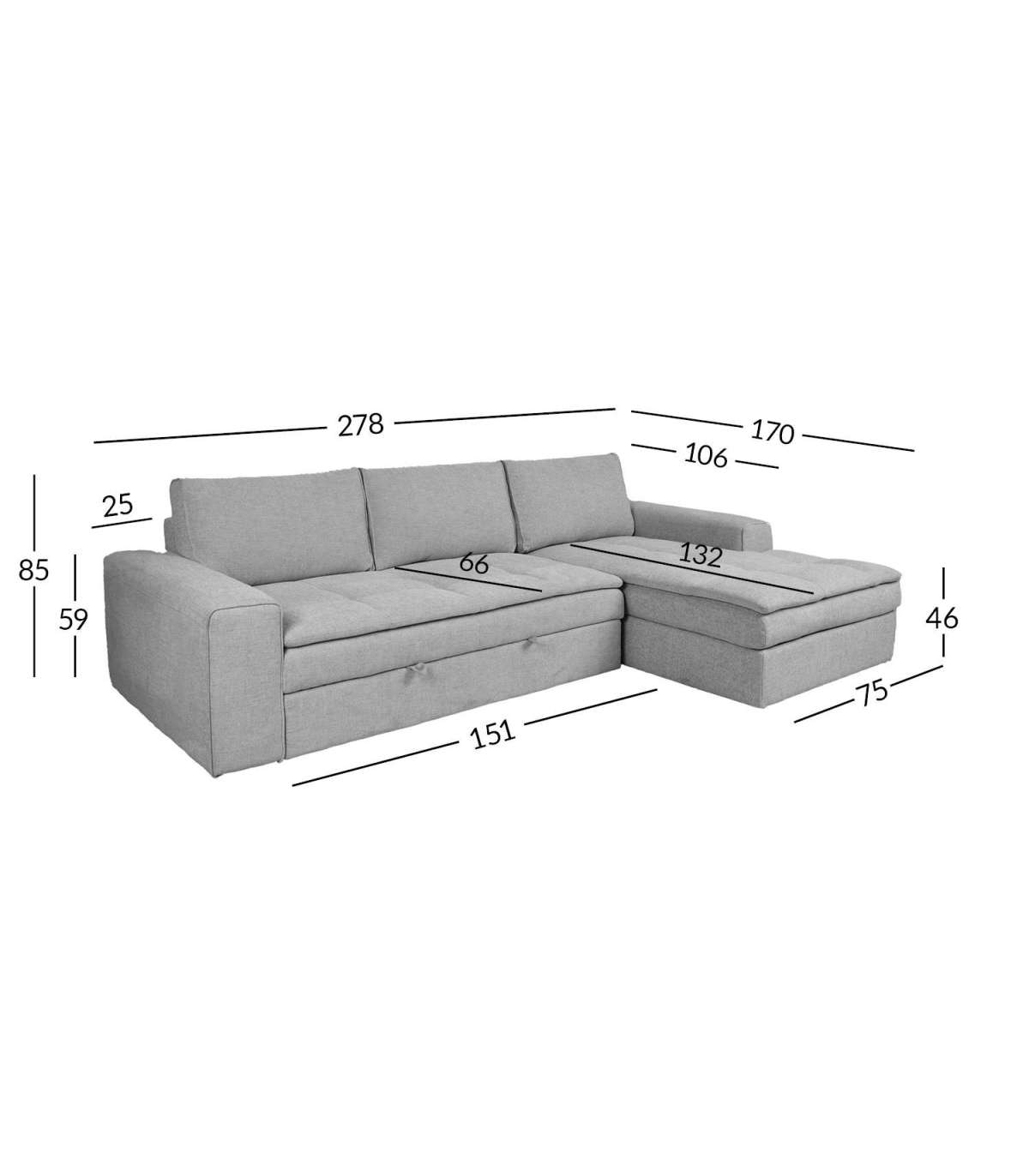 Diivani üldmõõdud on 278x106/170xH85cm. Istme laius 151+75cm, istme sügavus 66/132cm, istme kõrgus 46cm. Käetoe kõrgus maast 59cm, käetoe laius 25cm. Seljatoepadja mõõdud on 75x45x22cm.