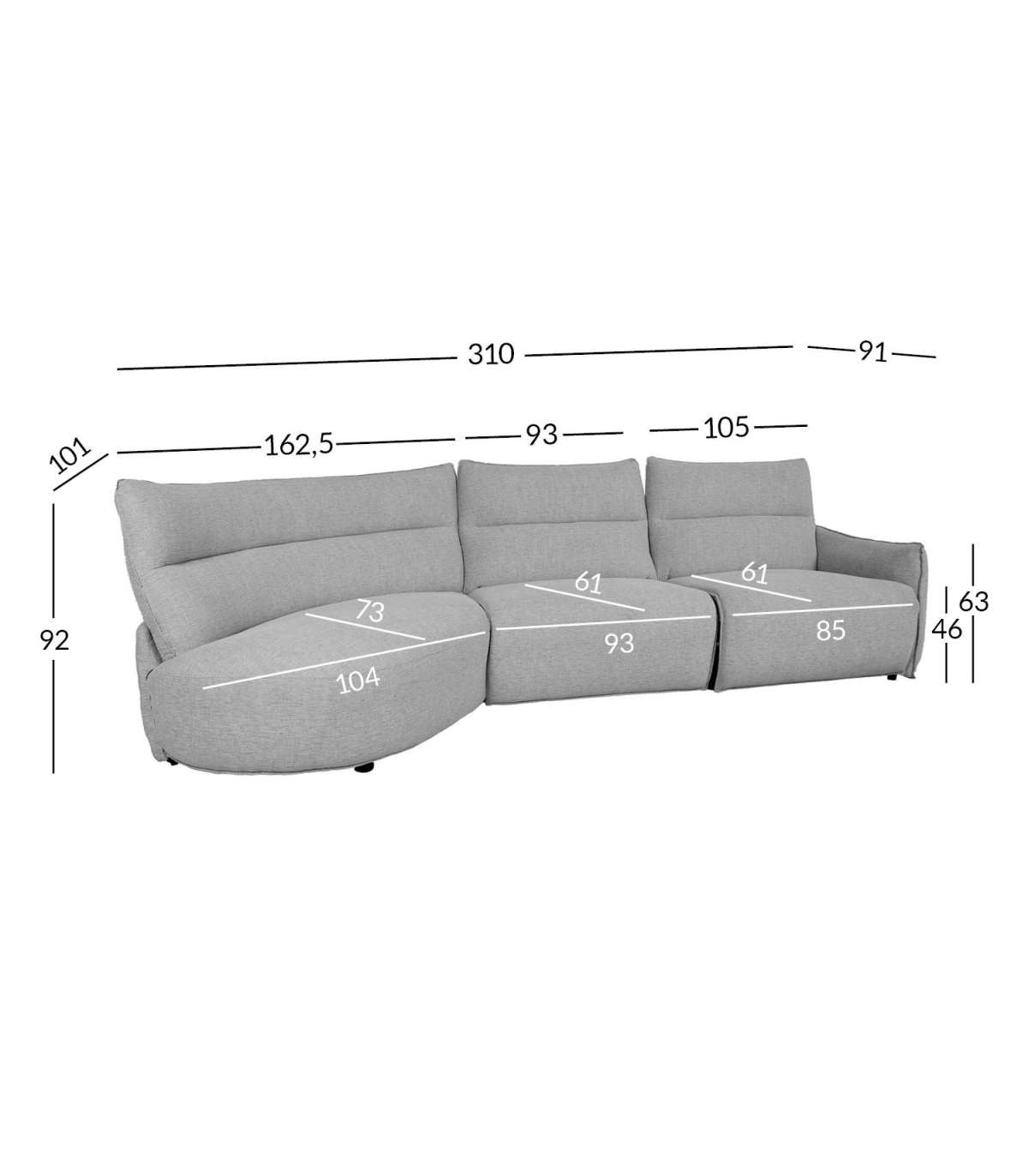 Diivani üldmõõdud on 310x101/91xH92cm.