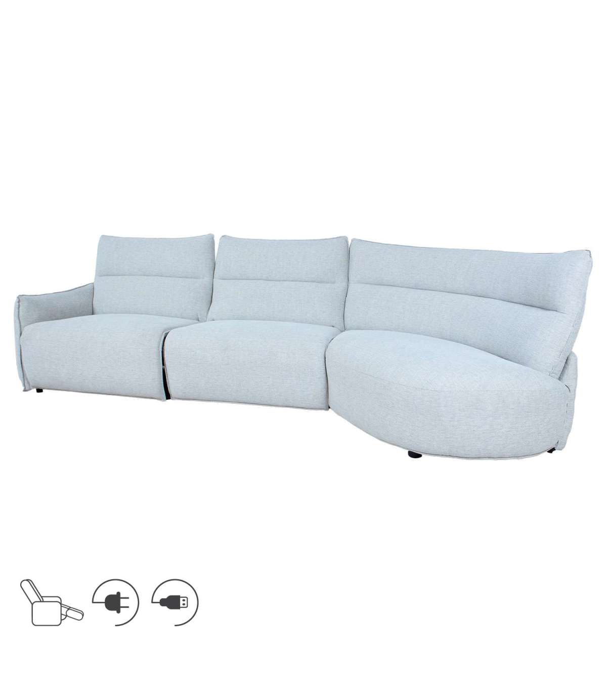 Kaarja kujuga recliner diivan mõjub uudselt ja pakub tõelist mugavust. Diivani voolujooneline nurgakuju maksimeerib istumisruumi ning reguleeritava selja- ja jalatoega iste võimaldab mõnusat lõõgastumist. Reguleerimisnupud ja USB port asuvad diivani käetoe välisküljel.