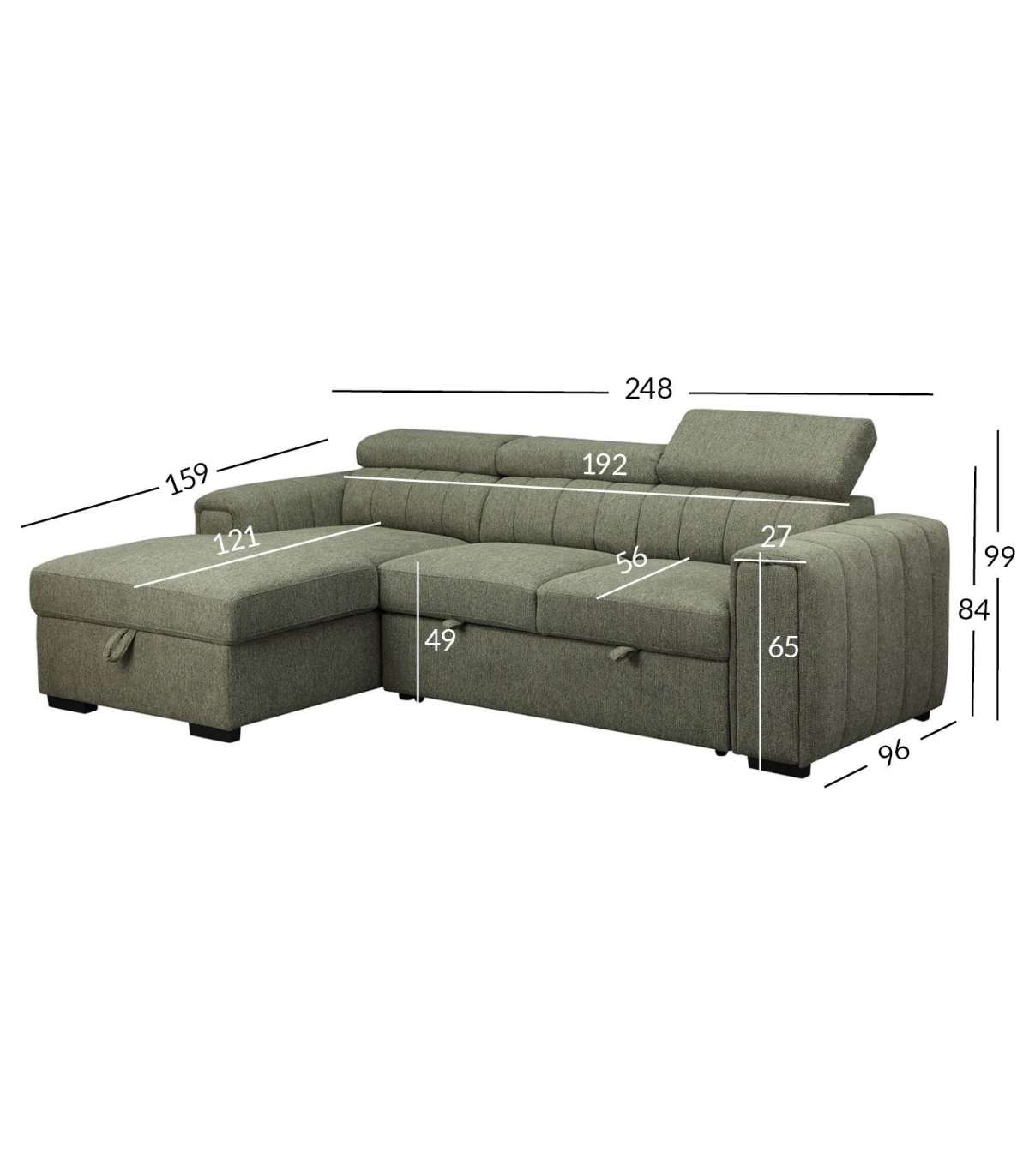 Diivani üldmõõdud on 248x159/96xH84/99cm. Istme laius 192cm, istme sügavus 56/121cm, istme kõrgus 49cm. Käetoe kõrgus maast 65cm, käetoe laius 27cm.