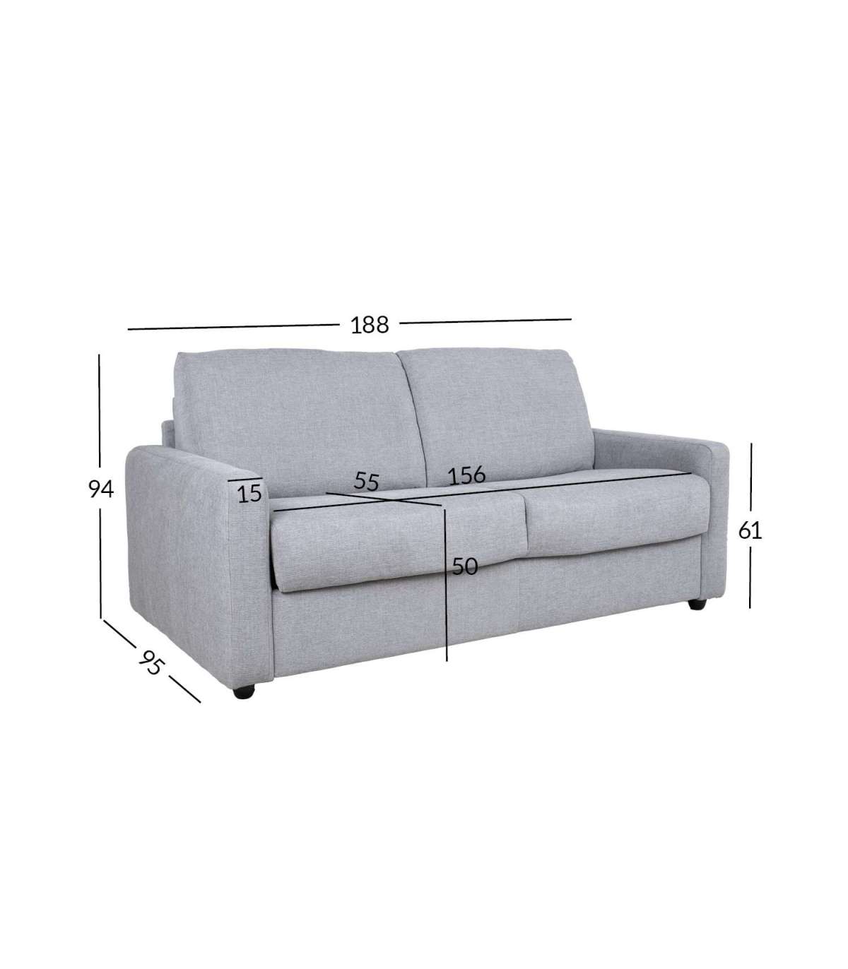 Diivani üldmõõdud on 188x95xH94cm. Istme laius 156cm, istme sügavus 55cm, istme kõrgus 50cm. Käetoe kõrgus maast 61cm, käetoe laius 15cm.