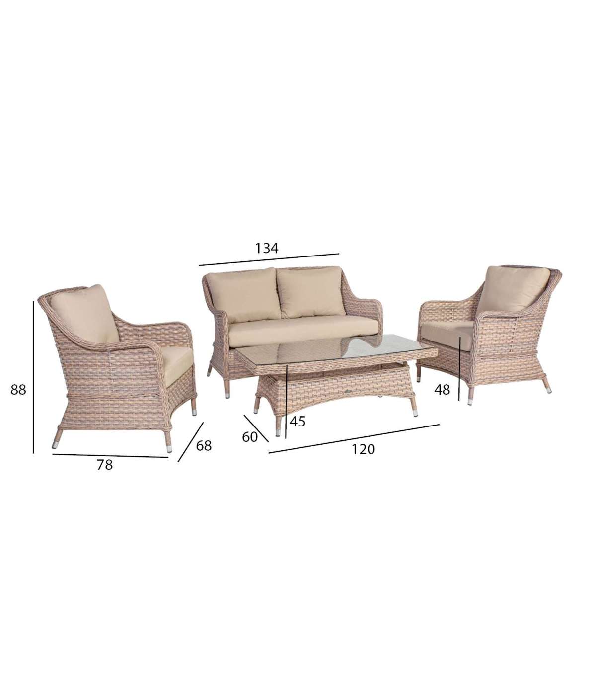 Aiamööblikomplekt EDEN laud, diivan ja 2 tugitooli. Komplekti kõigi osade raamid on valmistatud alumiiniumist ja kaetud bee˛i plastikpunutisega. Laua mõõdud on 120x60xH45cm, lauaplaat: 5mm läbipaistev karastatud klaas. Diivani mõõdud on 134x78xH88cm, tugitooli mõõdud 68x78xH88cm. Padjad kuuluvad komplekti. Padjakatted on valmistatud bee˛ist polüesterkangast. Toode on muutlikes ilmastikutingimustes vastupidav ja väga lihtsalt hooldatav, kaitset ilmastikutingimuste eest vajavad ainult padjad. Välitingimustes kasutatava mööbli eluea pikendamiseks soovitame kasutada välimööbli katteid. HOIUSTAMINE: suvehooaja lõppedes soovitame aiamööblit hoiustada siseruumides. Puhastage ja kuivatage mööbel enne hoiule panekut. Kasutage hoiustamiseks kuiva ning hea ventilatsiooniga ruumi.