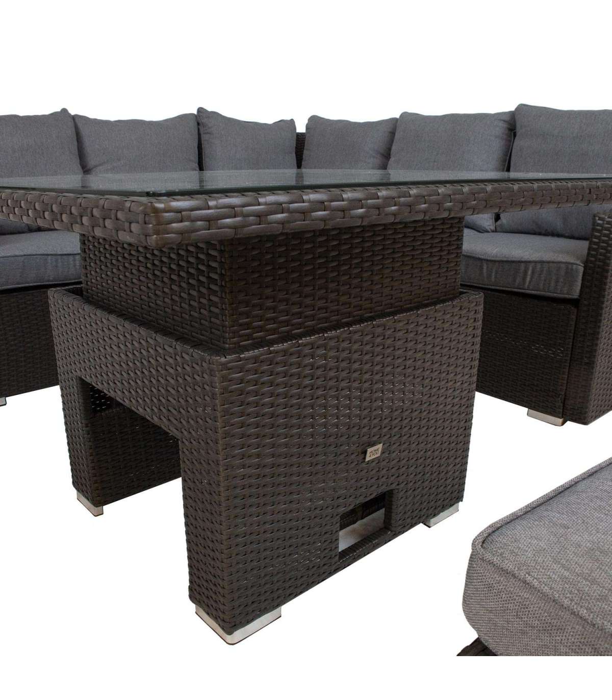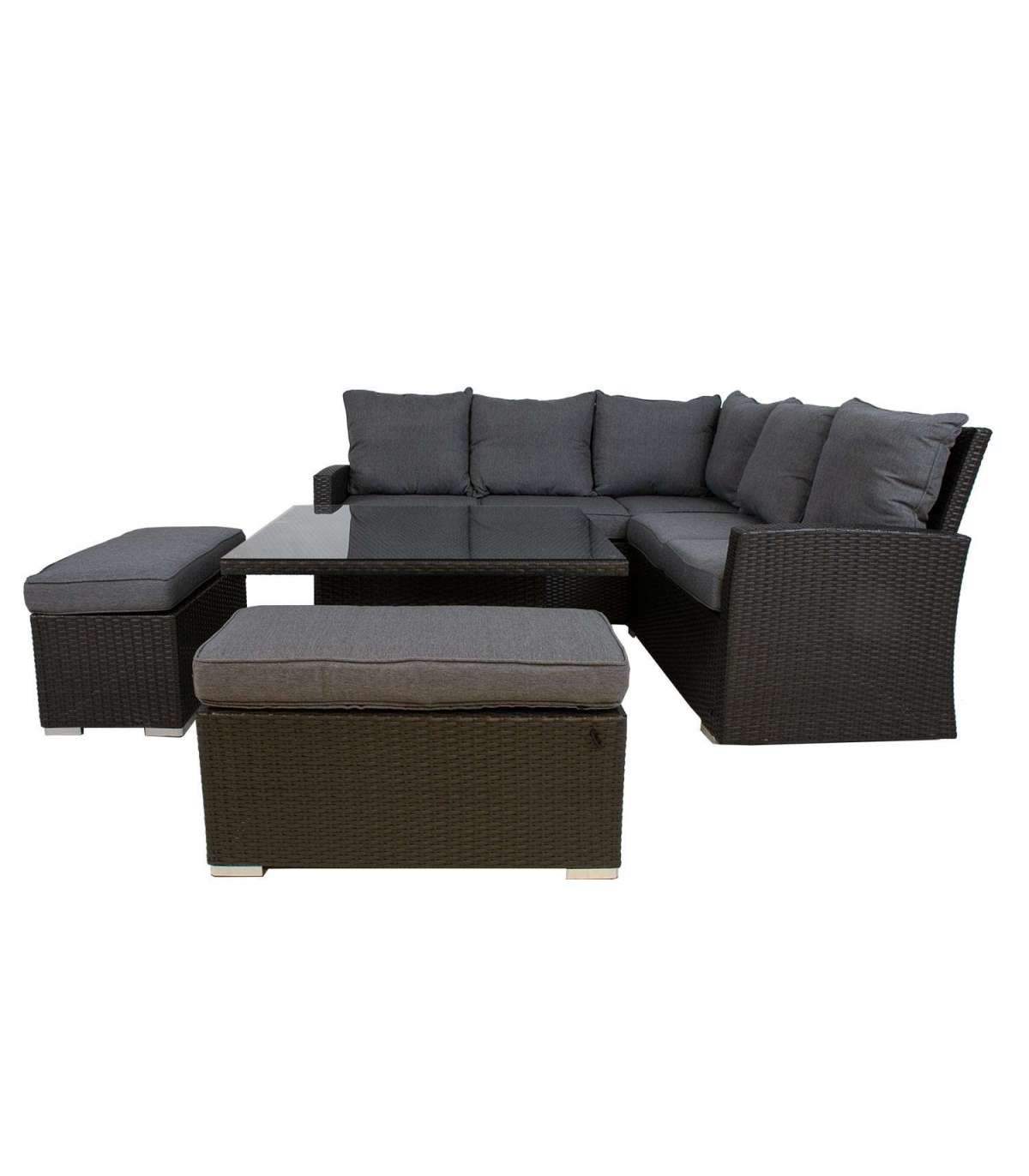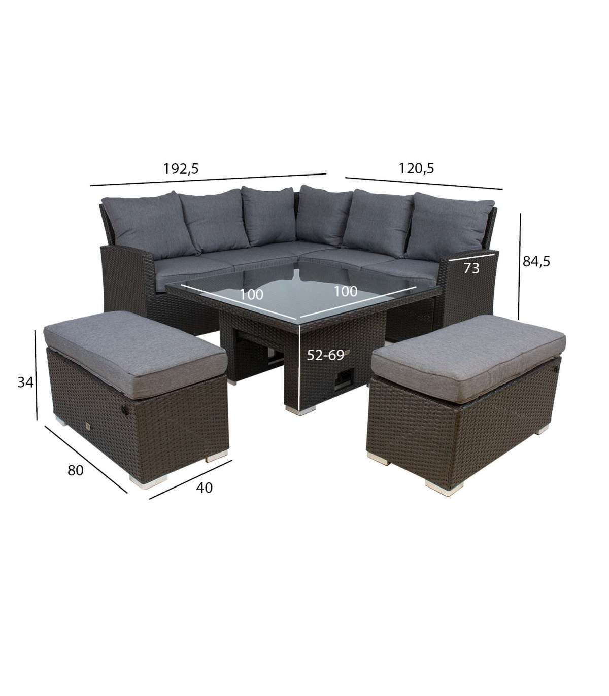 Aiamööblikomplekt MADRID reguleeritava kõrgusega laud, nurgadiivan, 2 tumbat. Diivani, tumba ja laua raam on valmistatud alumiiniumist ning kaetud pruuni plastikpunutisega. Laua mõõdud on 100x100xH52-69cm Lauaplaat: 8mm läbipaistev karastatud klaas. 3-kohalise diivani mõõdud on 192,5x73xH84,5cm, 2-kohalise diivani mõõdud on 120,5x73xH84,5cm, tumba mõõdud on 80x40xH34cm. Padjad kuuluvad komplekti. Padjakatted on valmistatud hallist polüesterkangast. Toode on muutlikes ilmastikutingimustes vastupidav ja väga lihtsalt hooldatav. Kaitset ilmastikuolude eest vajavad ainult padjad. Välitingimustes kasutatava mööbli eluea pikendamiseks soovitame kasutada välimööbli katteid. HOIUSTAMINE: suvehooaja lõppedes soovitame aiamööblit hoiustada siseruumides. Puhastage ja kuivatage mööbel enne hoiule panekut. Kasutage hoiustamiseks kuiva ning hea ventilatsiooniga ruumi.