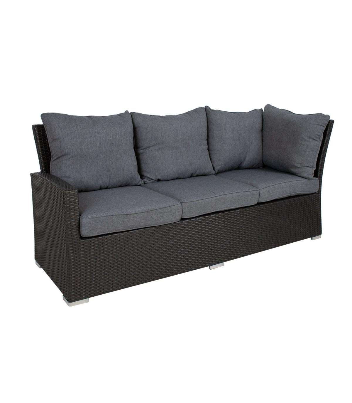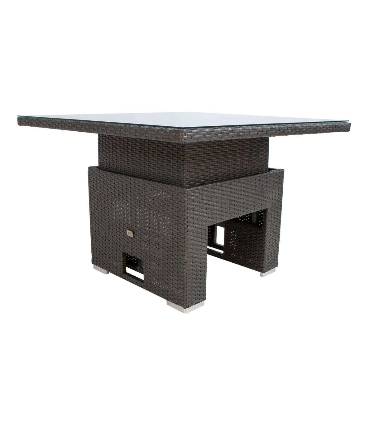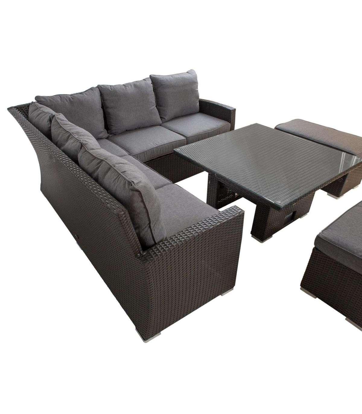 Aiamööblikomplekt MADRID reguleeritava kõrgusega laud, nurgadiivan, 2 tumbat. Diivani, tumba ja laua raam on valmistatud alumiiniumist ning kaetud pruuni plastikpunutisega. Laua mõõdud on 100x100xH52-69cm Lauaplaat: 8mm läbipaistev karastatud klaas. 3-kohalise diivani mõõdud on 192,5x73xH84,5cm, 2-kohalise diivani mõõdud on 120,5x73xH84,5cm, tumba mõõdud on 80x40xH34cm. Padjad kuuluvad komplekti. Padjakatted on valmistatud hallist polüesterkangast. Toode on muutlikes ilmastikutingimustes vastupidav ja väga lihtsalt hooldatav. Kaitset ilmastikuolude eest vajavad ainult padjad. Välitingimustes kasutatava mööbli eluea pikendamiseks soovitame kasutada välimööbli katteid. HOIUSTAMINE: suvehooaja lõppedes soovitame aiamööblit hoiustada siseruumides. Puhastage ja kuivatage mööbel enne hoiule panekut. Kasutage hoiustamiseks kuiva ning hea ventilatsiooniga ruumi.