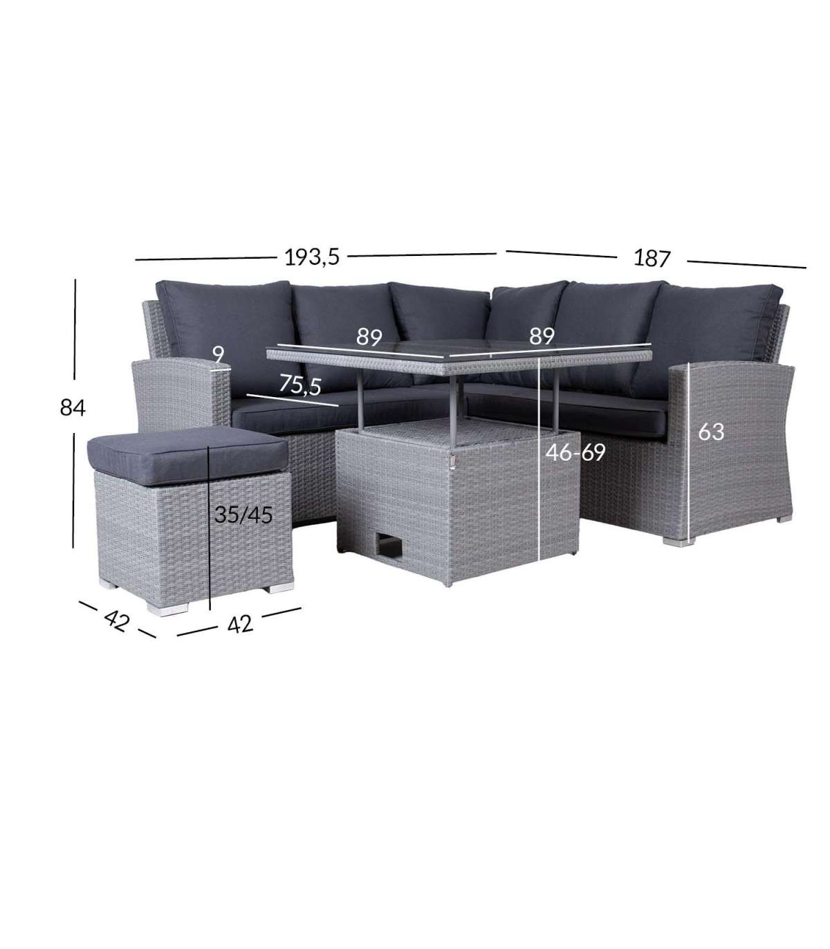 Aiamööblikomplekt SAMUEL muudetava kõrgusega laud, nurgadiivan ja tumba.