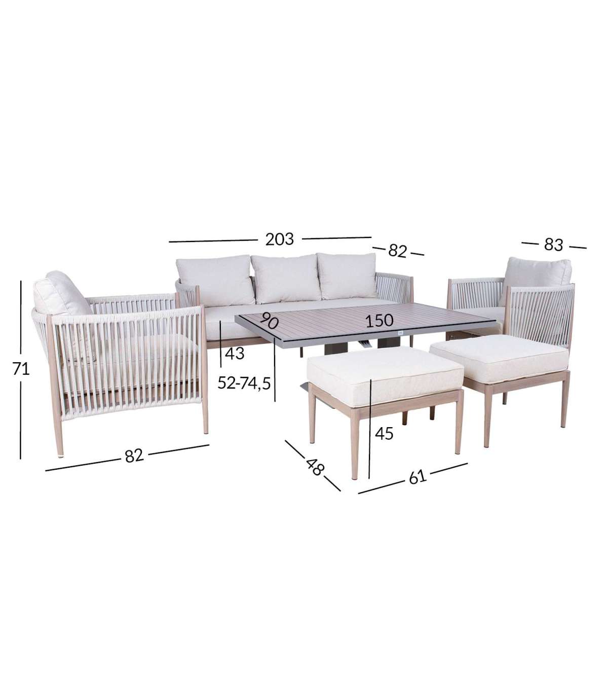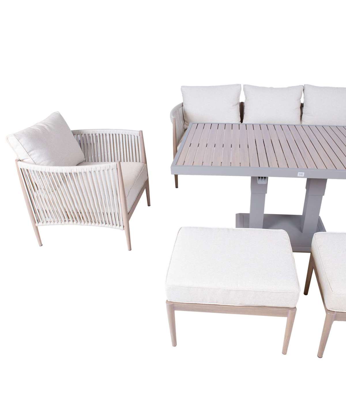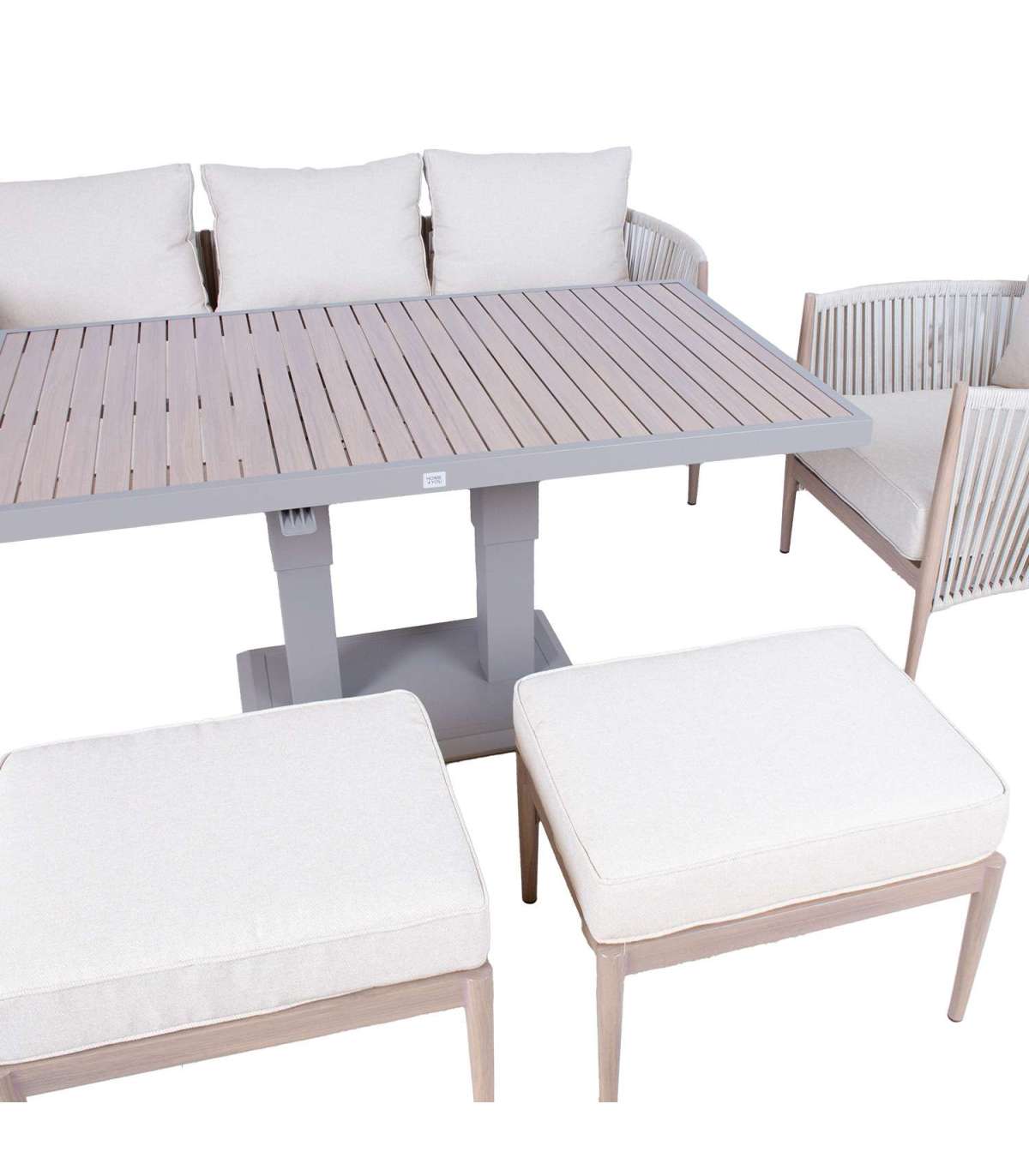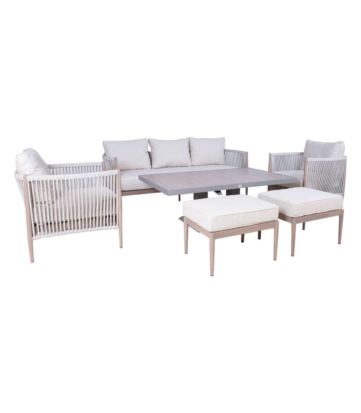 Aiamööblikomplekt MEDINA muudetava kõrgusega laud, 3-kohaline diivan, 2 tugitooli ja 2 tumbat, beež.