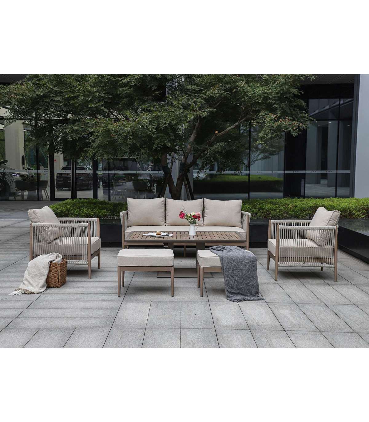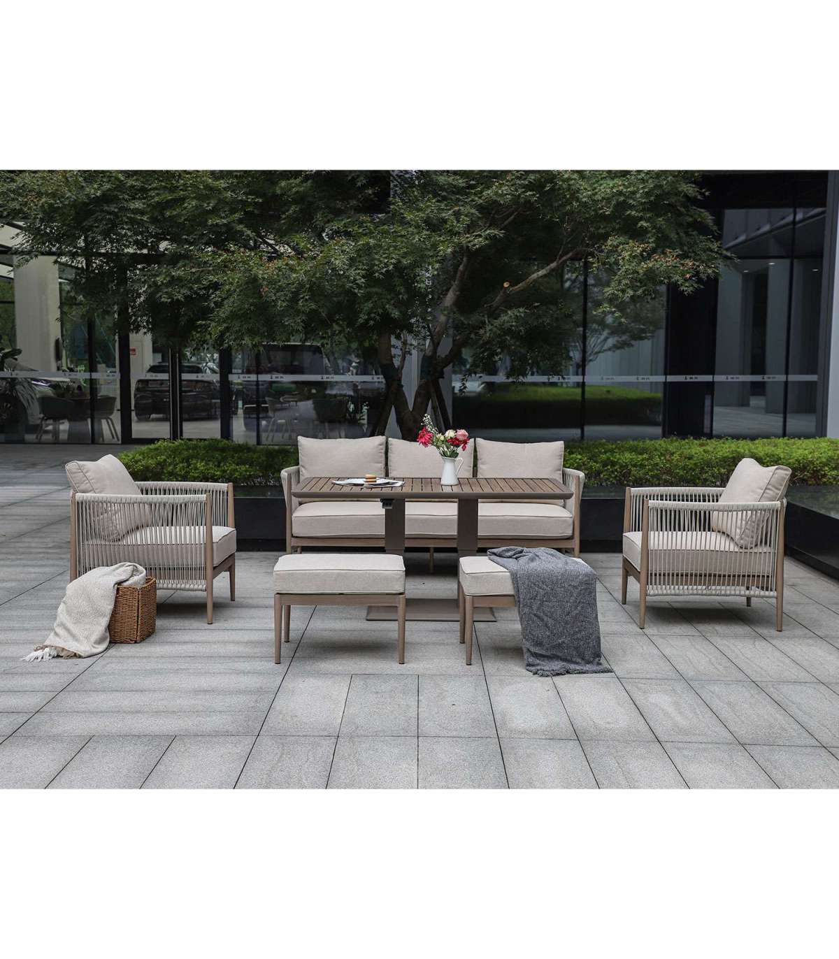 Aiamööblikomplekt MEDINA laud, diivan, 2 tugitooli ja 2 tumbat, beež