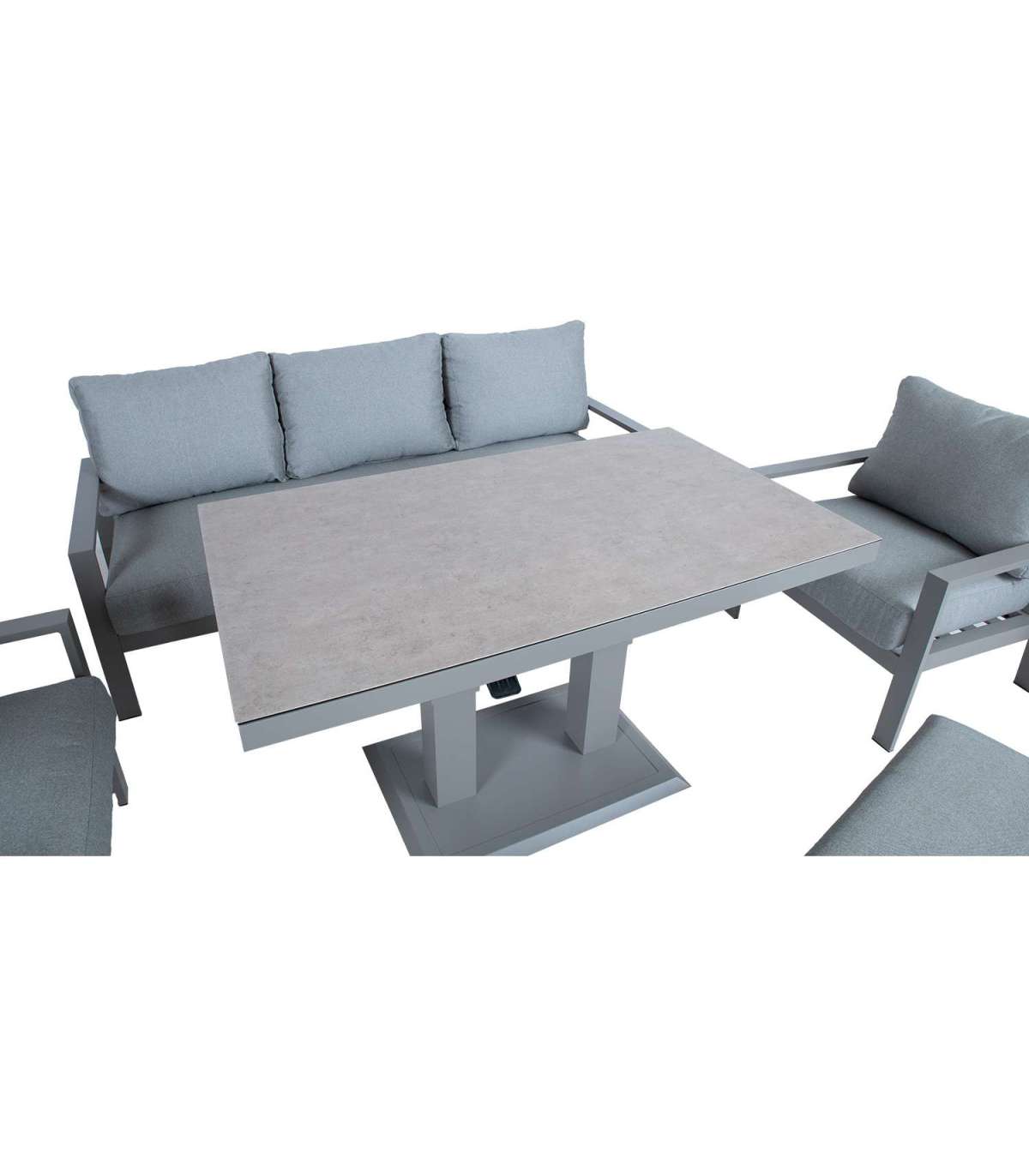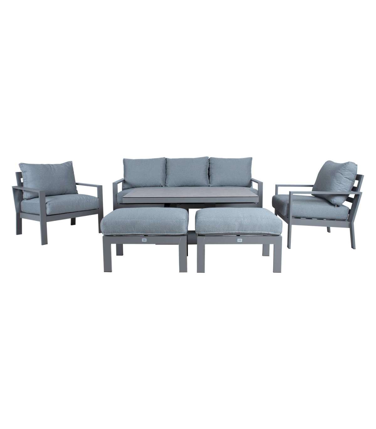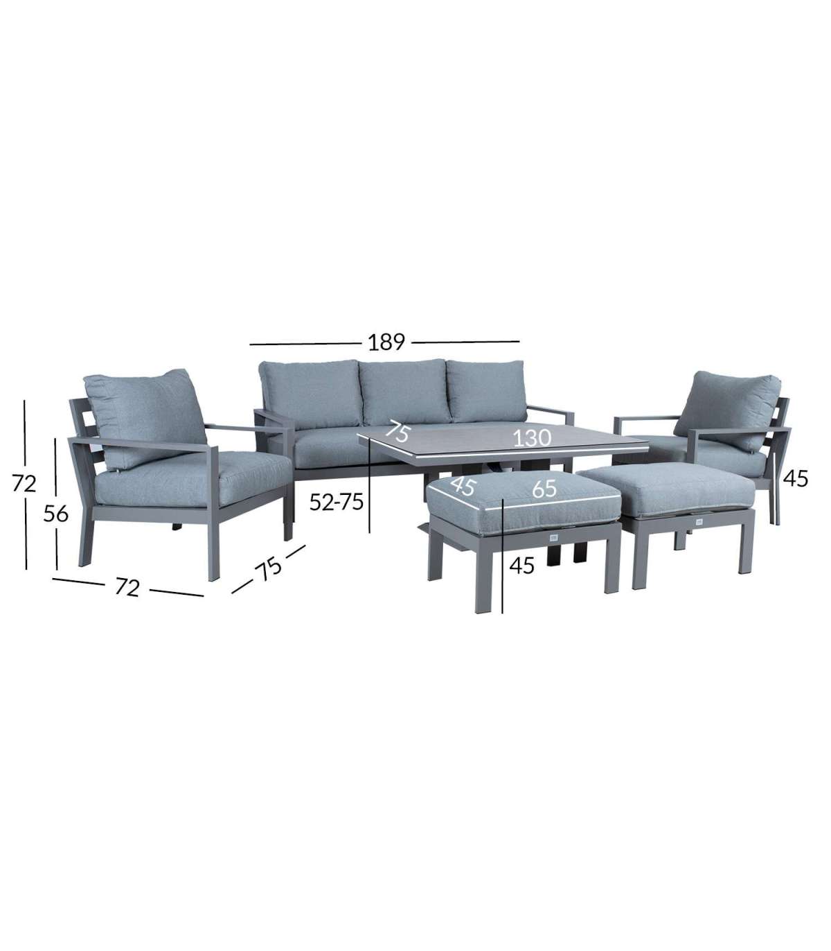 Komplekti kuulub muudetava kõrgusega laud, 3-kohaline diivan, 2 tugitooli ja 2 tumbat.