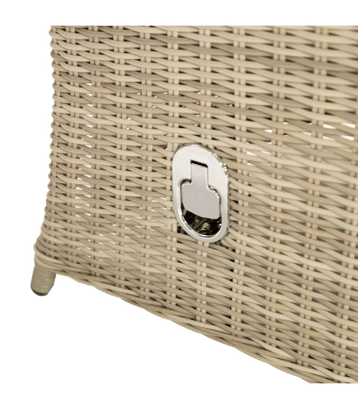 Aiamööblikomplekt EMERALD laud, diivan ja 2 tooli. Kõigi komplekti osade raamid on valmistatud alumiiniumist ja kaetud plastikpunutisega. Laua mõõdud on 109x65xH61,5cm. Lauaplaat: 5mm karastatud klaas. Diivani mõõdud on 120x70,5xH98,5cm, tooli mõõdud on 62x70,5xH98,5. Toolide ja diivani seljatoed on reguleeritavad. Padjad kuuluvad komplekti. Padjakatted on valmistatud helehallist polüesterkangast. Istmepatjade paksus 6cm. Toode on muutlikes ilmastikutingimustes vastupidav ja väga lihtsalt hooldatav. Kaitset ilmastikuolude eest vajavad ainult padjad. Välitingimustes kasutatava mööbli eluea pikendamiseks soovitame kasutada välimööbli katteid. HOIUSTAMINE: suvehooaja lõppedes soovitame aiamööblit hoiustada siseruumides. Puhastage ja kuivatage mööbel enne hoiule panekut. Kasutage hoiustamiseks kuiva ning hea ventilatsiooniga ruumi.