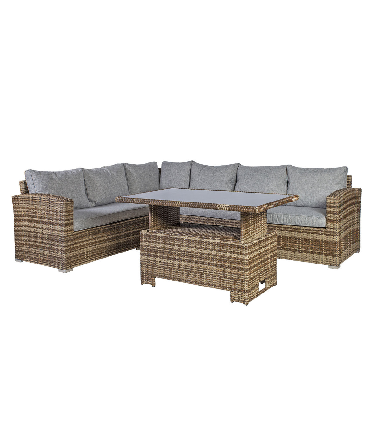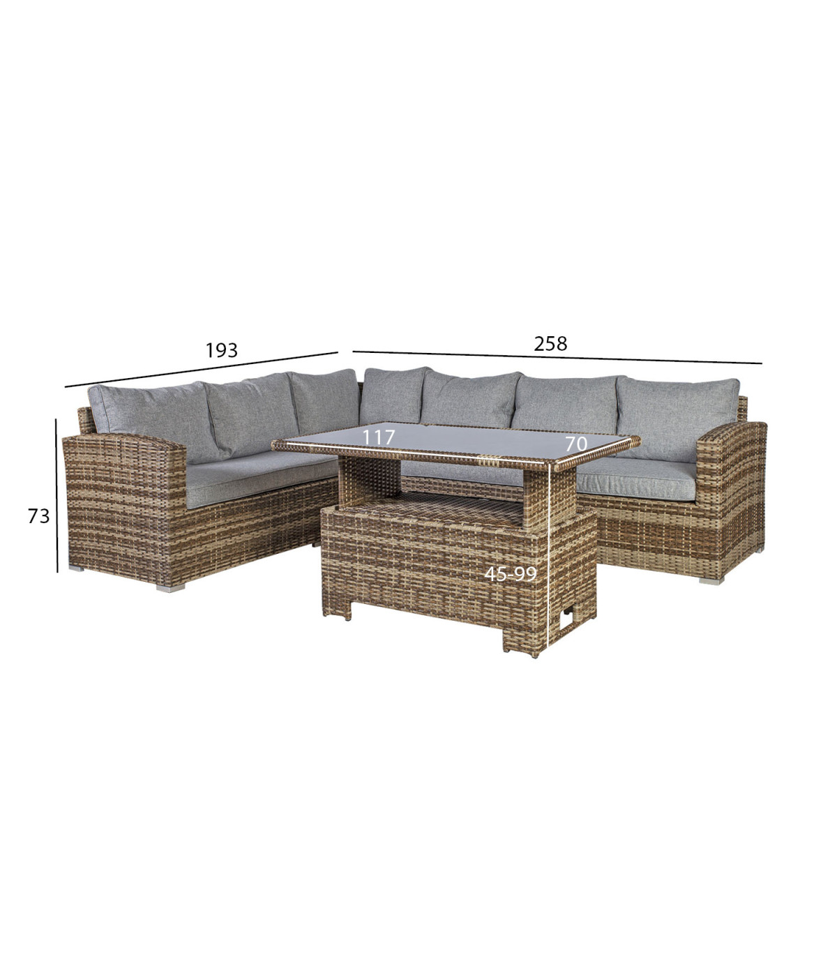 Aiamööblikomplekt ZURICH nurgadiivan ja muudetava kõrgusega laud. Diivani ja laua raam on valmistatud alumiiniumist ja kaetud pruunides toonides plastikpunutisega. Nurgadiivan koosneb kahest 3-kohalist moodulist mõõtudega 193x74xH73cm ja 184x74xH73cm. Diivani üldmõõdud on 193/258x74xH73cm. Istmekõrgus 44cm (koos padjaga). Käetoe kõrgus maast 63cm. Diivani juurde kuulub 2 istmepatja 174x65xH9cm ja 7 seljatoepatja. Padjakatted on valmistatud hallist polüesterkangast. Laua mõõdud on 117x70xH45/69cm, lauaplaat: 5mm must karastatud klaas. Toode on muutlikes ilmastikutingimustes hästi vastupidav ja lihtsalt hooldatav. Kaitset ilmastikuolude eest vajavad ainult padjad. Välitingimustes kasutatava mööbli eluea pikendamiseks soovitame kasutada välimööbli katteid. HOIUSTAMINE: suvehooaja lõppedes soovitame aiamööblit hoiustada siseruumides. Puhastage ja kuivatage mööbel enne hoiule panekut. Kasutage hoiustamiseks kuiva ning hea ventilatsiooniga ruumi.