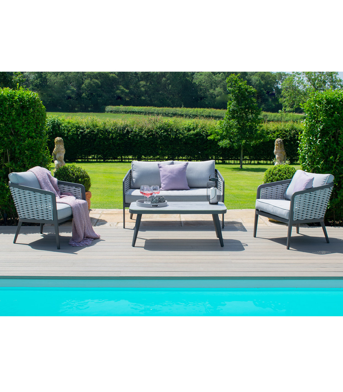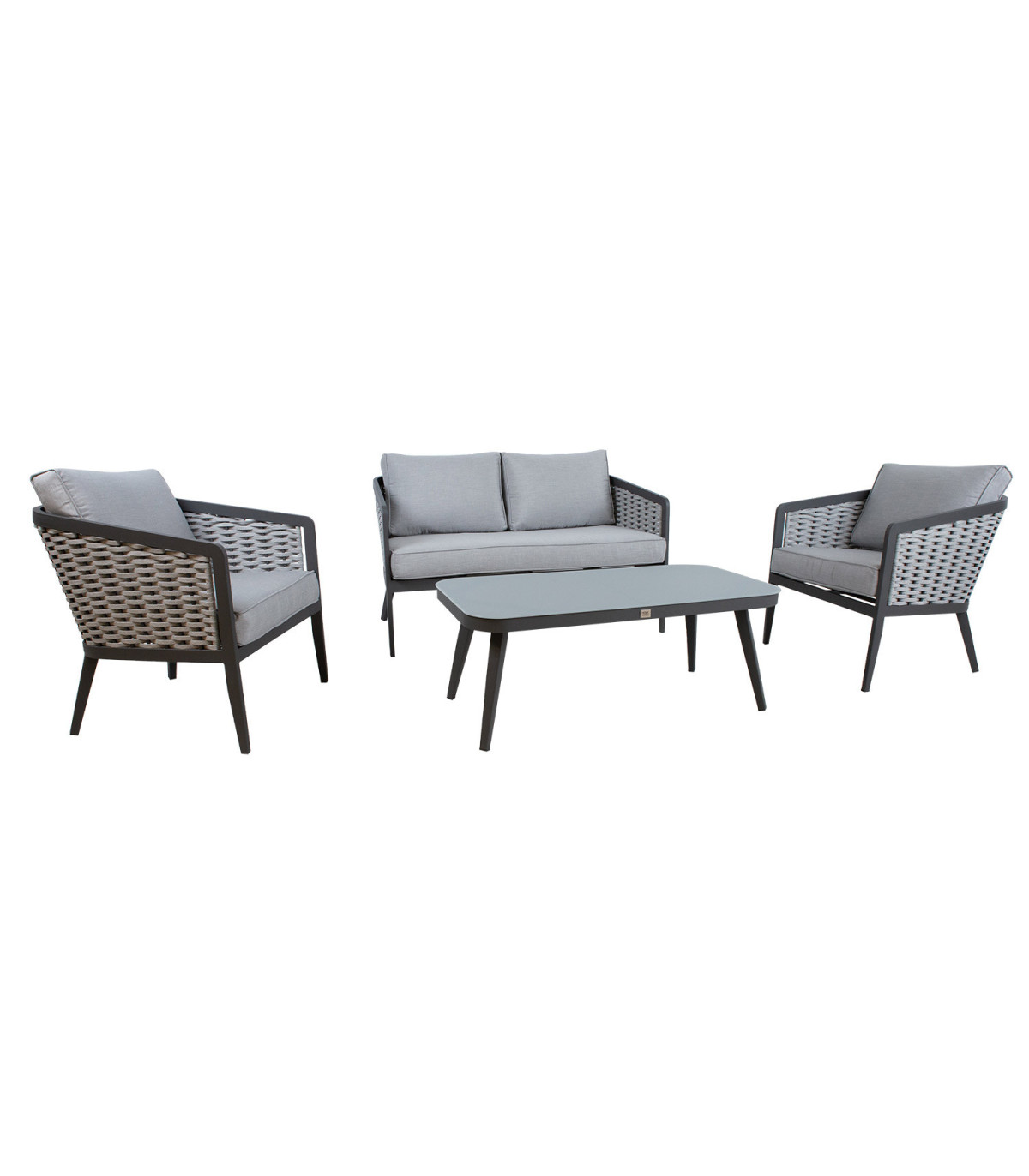 Aiamööblikomplekt MARIE laud, diivan ja 2 tooli, hall. Toolide ja diivani raam on valmistatud alumiiniumist ja viimistletud halli pulbervärviga, seljatoed on kaetud helehalli nöörpunutisega. Padjad kuuluvad komplekti. Padjakatted on valmistatud helehallist olefin kangast. Lauaplaat: 5mm hall dekoorklaas. Mõõdud: laud 110x56xH42cm, tool 68x72x73cm, diivan 132x72xH73cm. Toode on muutlikes ilmastikutingimustes hästi vastupidav ja lihtsalt hooldatav. Kaitset ilmastikuolude eest vajavad ainult padjad. Välitingimustes kasutatava mööbli eluea pikendamiseks soovitame kasutada välimööbli katteid. HOIUSTAMINE: suvehooaja lõppedes soovitame aiamööblit hoiustada siseruumides. Puhastage ja kuivatage mööbel enne hoiule panekut. Kasutage hoiustamiseks kuiva ning hea ventilatsiooniga ruumi.