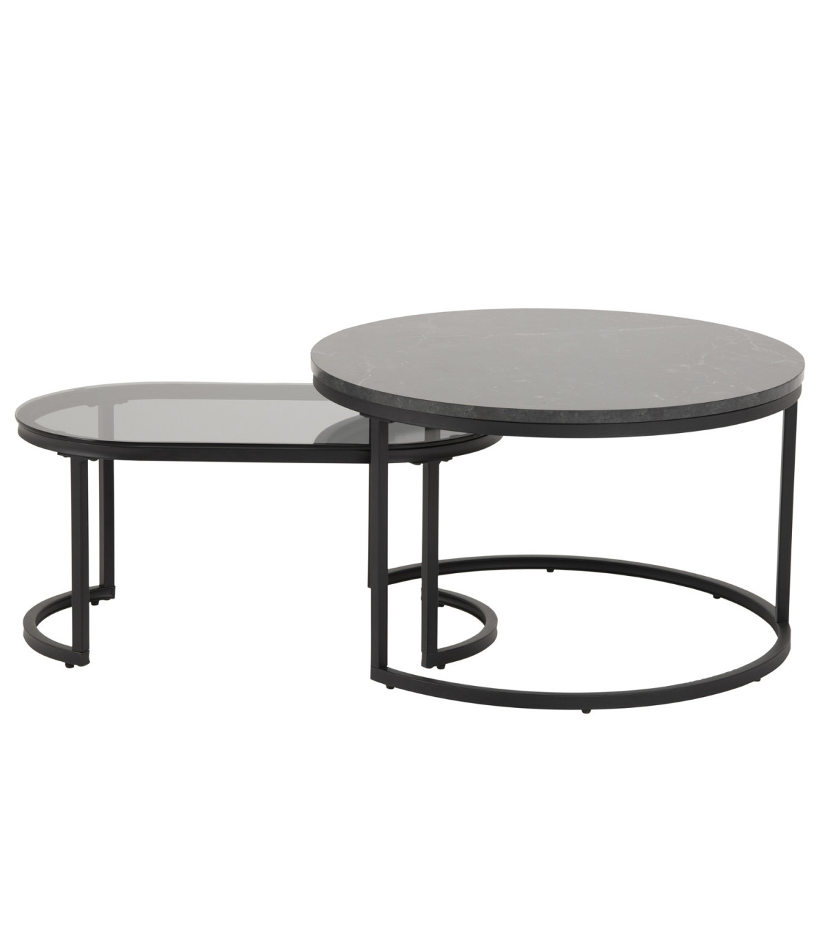 Diivanilauakomplekt sobib suurepäraselt keskpunktiks moodsatesse elutubadesse. Geomeetriast inspireeritud komplektis on ümar ja ovaalne kujund ühendatud, luues harmoonilise tulemi. Komplektist õhkub elegantsi. Kujundite ja materjalide koosmõju lisab igale ruumile sügavust ja visuaalset huvi. Üks lauaplaat on valmistatud marmorimustriga melamiinist, teine ??6mm paksusest klaasist. Alus on valmistatud mattmustast pulbervärvitud metallist. Mõõdud on D70xH42cm ja 70x40xH33cm.