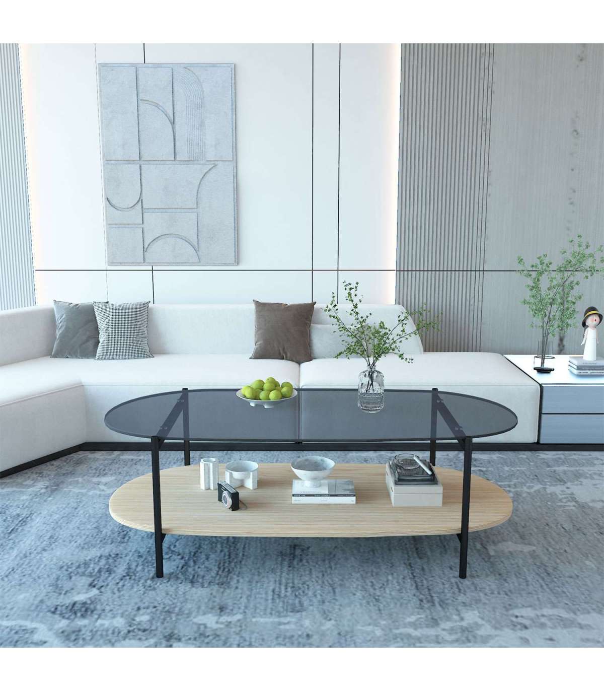 Lauaplaat: hall karastatud klaas. Alumine riiul: hele tammedekooriga melamiinplaat.