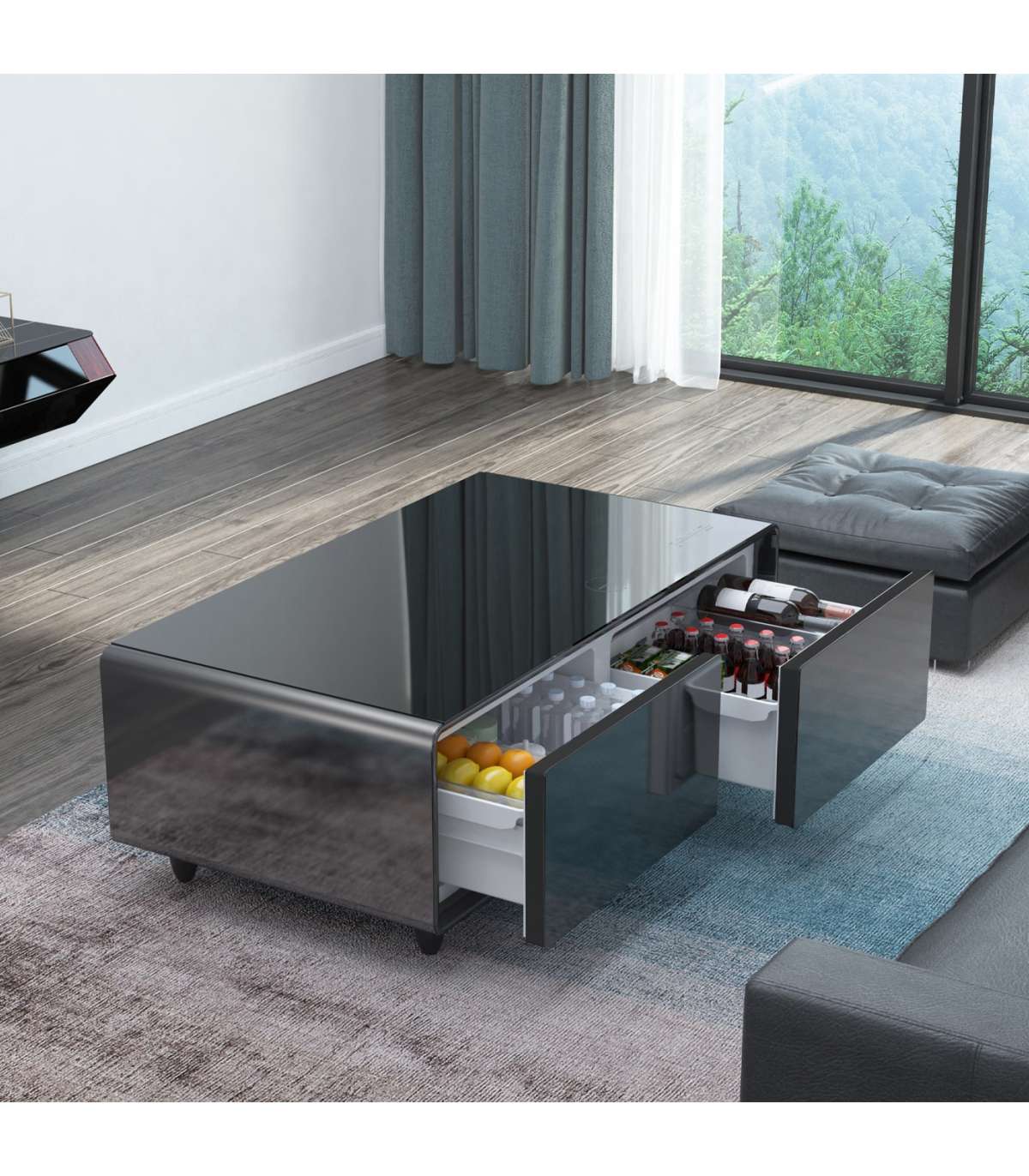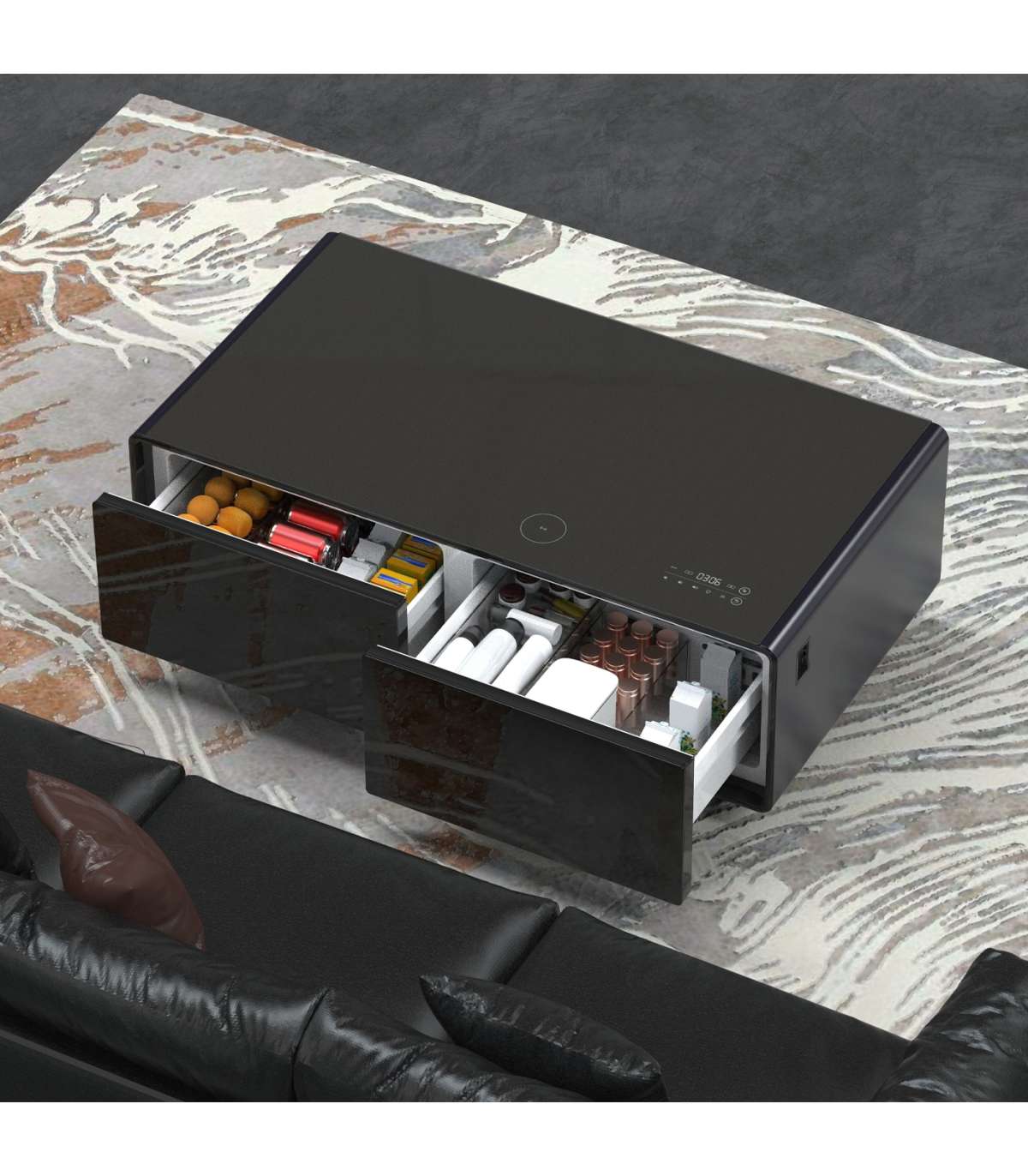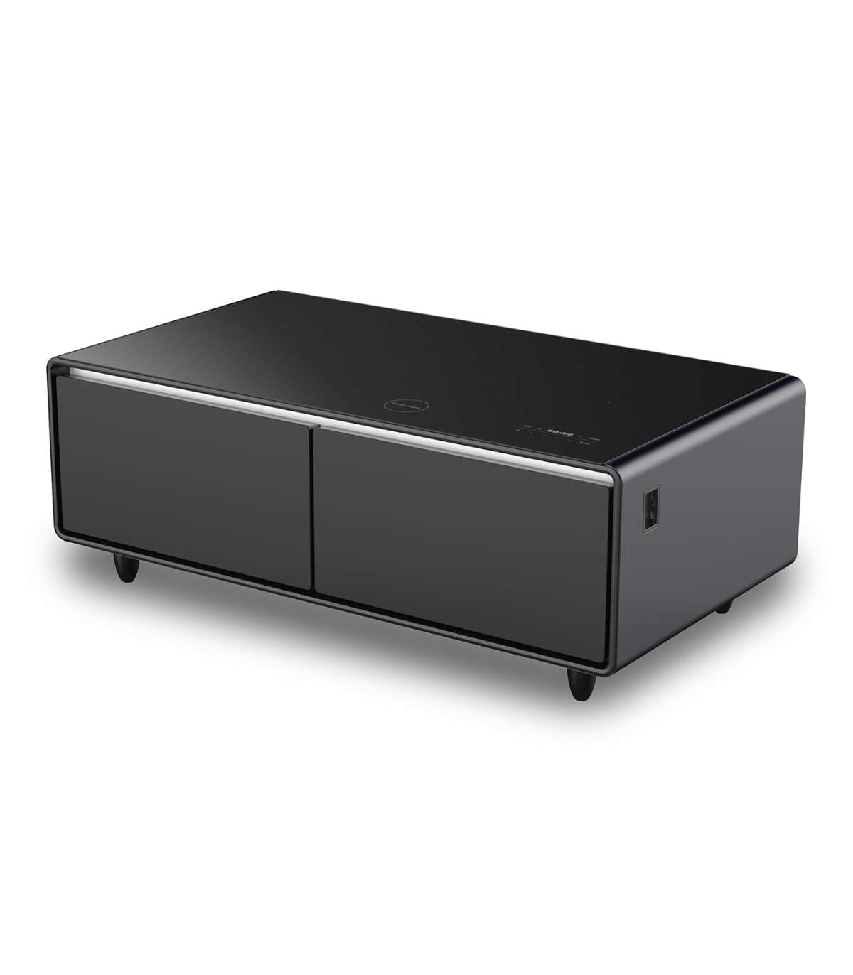 LOUNGE TABLE WITH COOLING COMPARTMENTS, SOUND BAR AND CHARGING OPTION + Lounge table with cooling compartments, integrated music speakers and charging option for smartphones etc. + Reliable compressor cooling + Two cooling compartments (total 135 l) for snacks and drinks with individually adjustable temperature: • Left cooling zone: 3 – 8 °C / 70 l volume • Right cooling zone: 6 – 12 °C / 65 l volume + The practical ECO mode ensures the temperature setting with the lowest power consumption (depending on the ambient temperature) + Convenient playback of music etc. via Bluetooth 5.0 + Different sound programme: auto, rock, film, pop, jazz + With RGB LED light strip for atmospheric ambience: Individual lighting depending on the music setting + Practical charging options: • USB ports: 2x USB (5 V) and 1x USB-C (5 V). • Wireless charging for compatible smartphones (up to 15 W ) + LED display with touch control panel + High-quality tempered glass with a max. load of up to 200 kg + Acoustic signal if the refrigerator compartment is open for too long + Black body with black glass top
