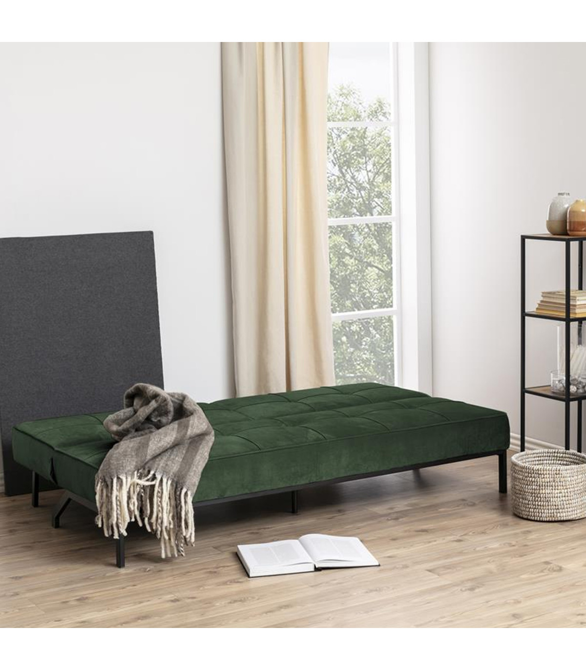 Diivanvoodi on väga mitmekülgne ja sobib suurepäraselt mitmeotstarbelistesse ruumidesse. Väikeste eluruumide jaoks mõeldud mugaval diivanvoodil on kolm erinevat asendit. Diivani saab kergesti panna lamavasse asendisse või muuta ka voodiks, et külalised saaksid mugavalt magada. Diivan on kaetud sametkangaga. Jalad on musta värvi metallist. Mõõdud avatud asendis on 120x198cm. Diivani mõõdud on 198x95x87cm.