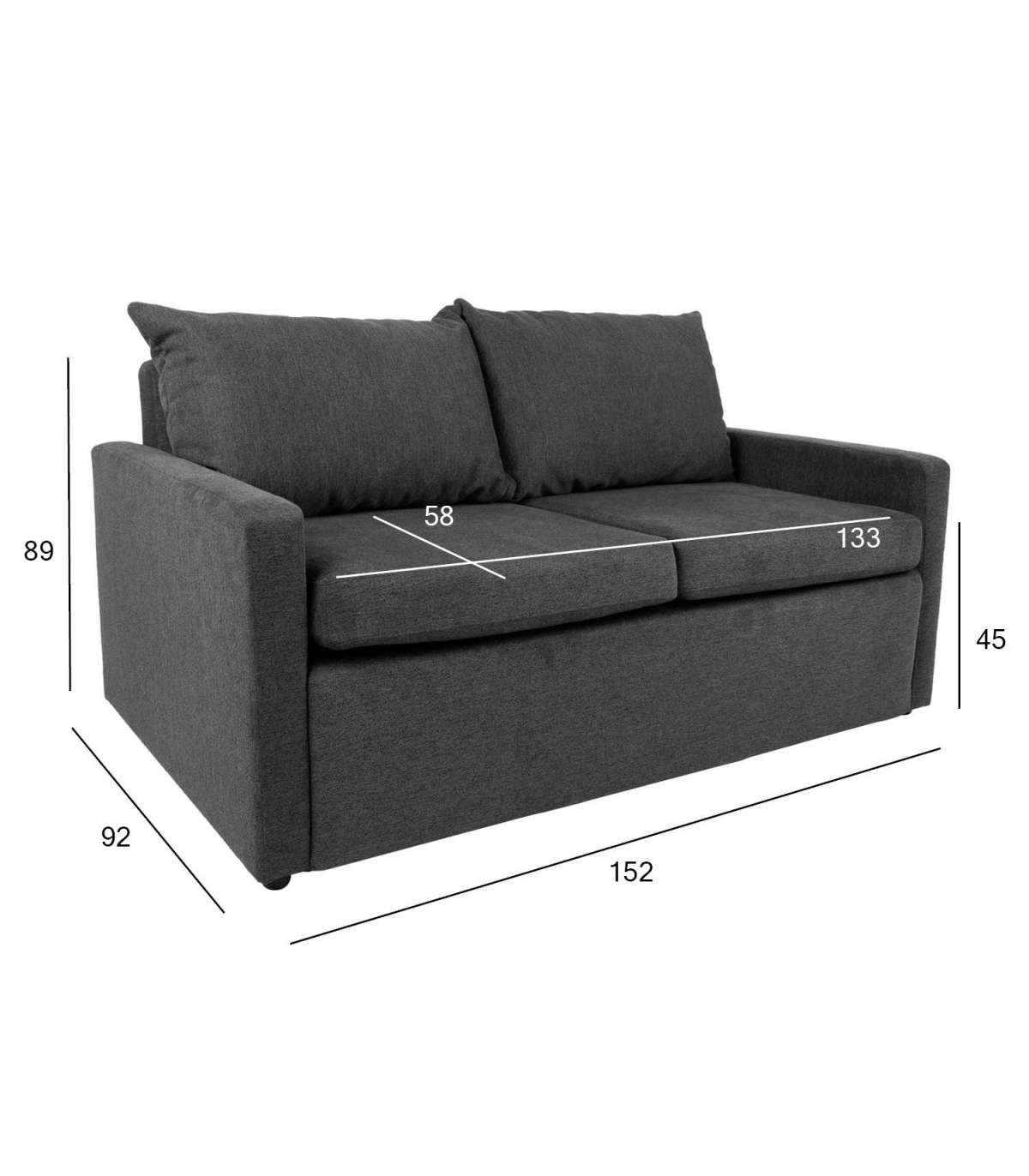 Diivani üldmõõdud on 152x92xH89cm, istme kõrgus 45cm. Magamisosa mõõdud avatuna 134x195cm.