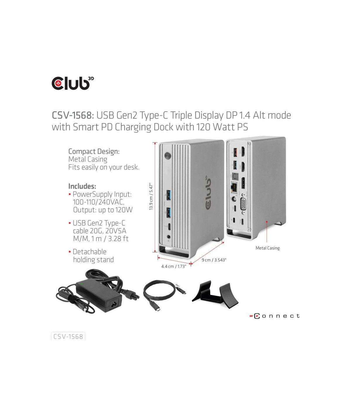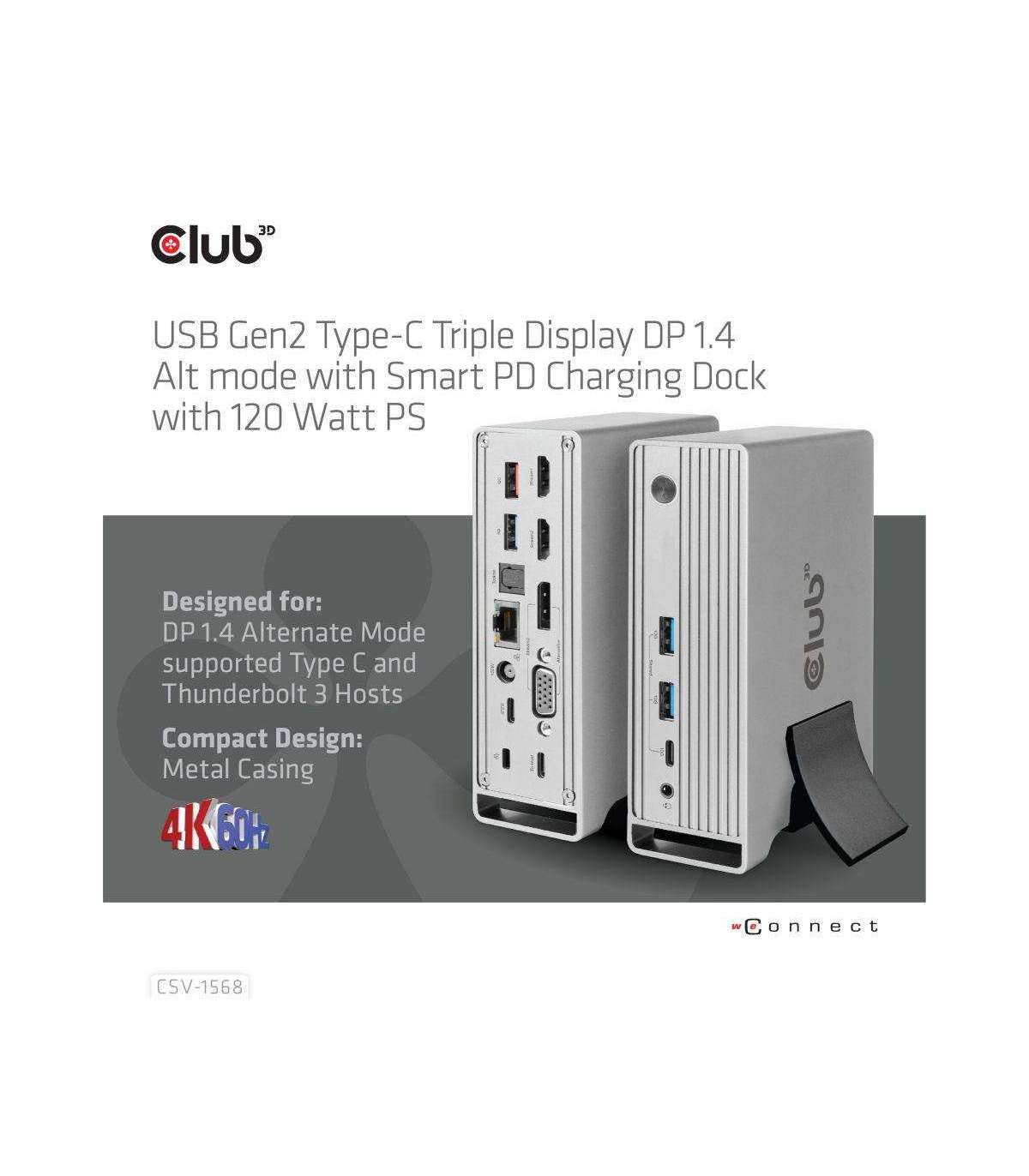 The Club 3D CSV-1568 USB Gen2 Type-C Triple Display DP™ Alt mode + Smart PD Charging Dock with 120 Watt PSU, is an integrated solution combining Video, Data, Power, Ethernet and Audio. It has 4 videos (output 3 videos simultaneously under MST mode) for video transmission, 4 USB data ports (2 USB-A 10G, 1 Type-C 10G, 1 USB-A 5G) for data transmission, 1 USB-A smart charging port for quick charging, 1 Gigabit Ethernet for super fast Ethernet, 2 audio ports (3.5mm audio, Toslink) for enjoying music. Besides, this dock is equipped with dual power jack (Type-C PD Charging or 120W DC power supply). It supports all DP Alt mode1.4/1.2 supported Type-C and Thunderbolt™ 3 host (PC, laptop, mobile phone, etc.) under Windows and under MacOS X based on Intel you will only get limited SST Function or Single display Only.