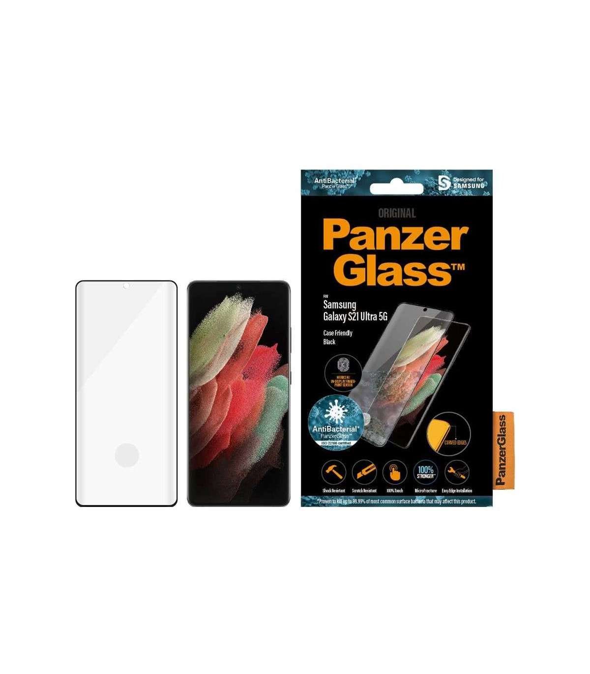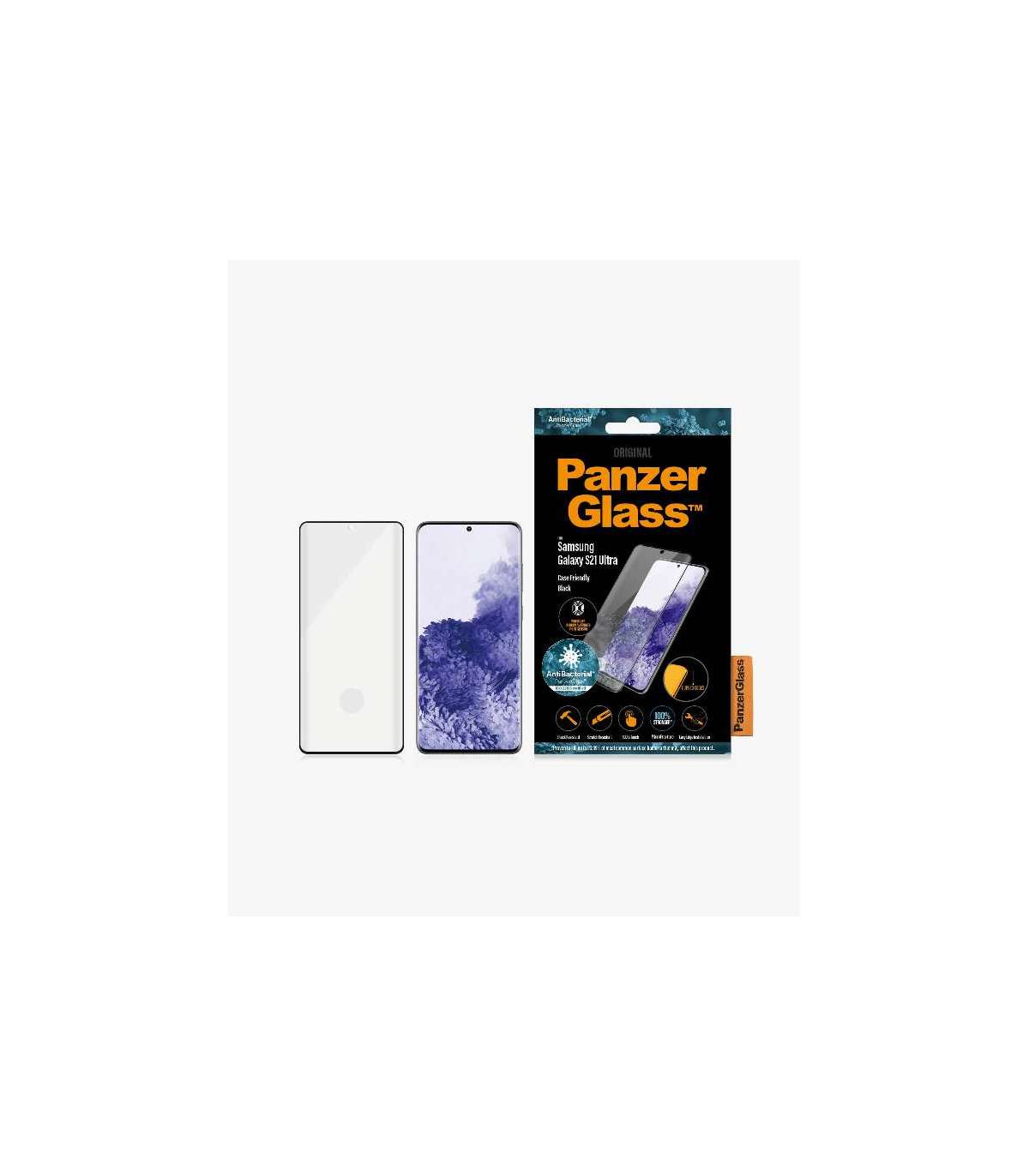 PanzerGlass | Samsung | Galaxy S21 Ultra Series | Antibacterial glass | Black | Case Friendly, Compatible with the in-screen fingerprint reader | Antifingerprint screen protector