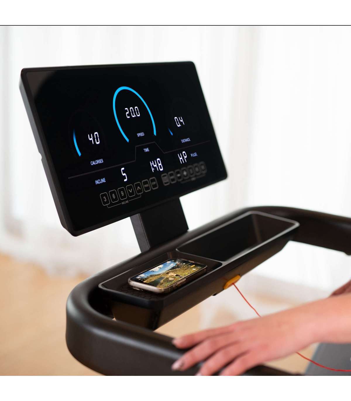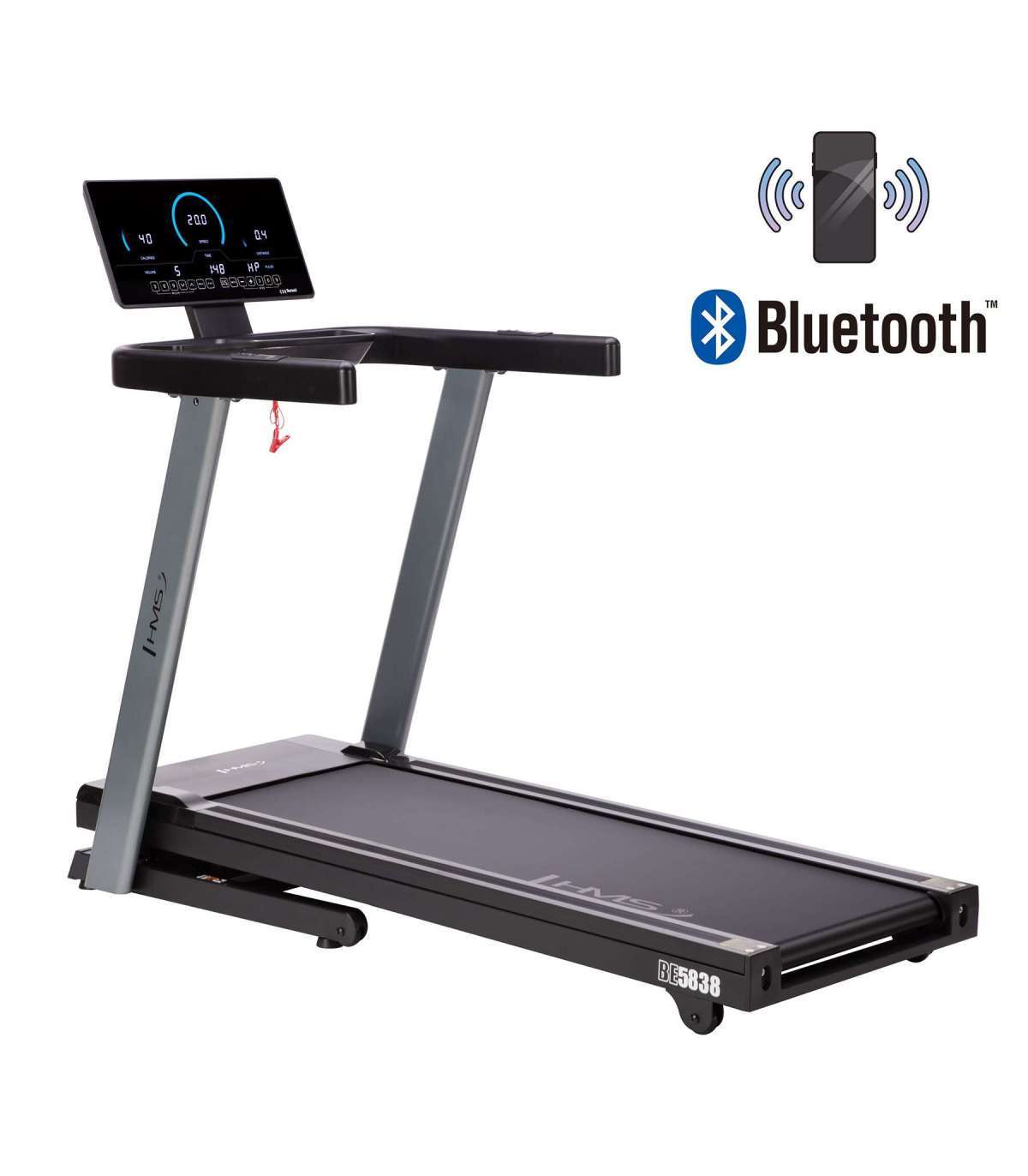BE5838 jooksumismasin on varustatud Bluetoothiga, et ühendada treeningrakendustega (Kinomap, Zwift, AnyRun) ja sisseehitatud kõlaritega muusika esitamiseks. Oma lemmiklugude või podcastide kuulamine treeningu ajal on nüüd uskumatult lihtne! Need on uuenduslikud lahendused, mis võimaldavad teil nautida iga hetke jooksumismasinal.