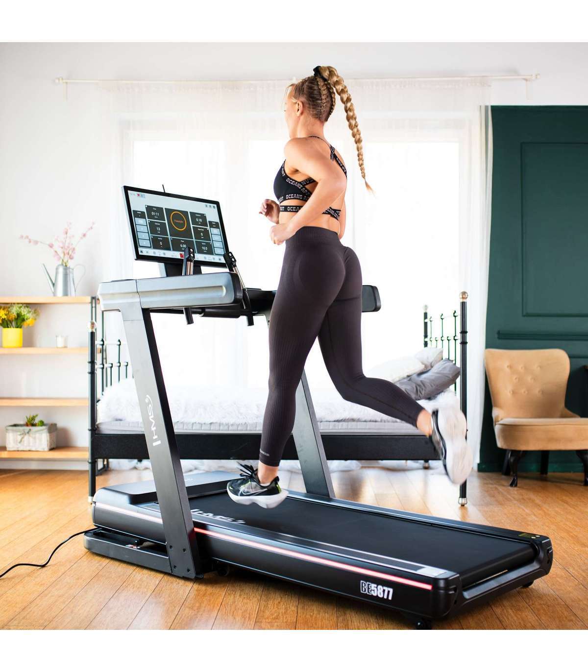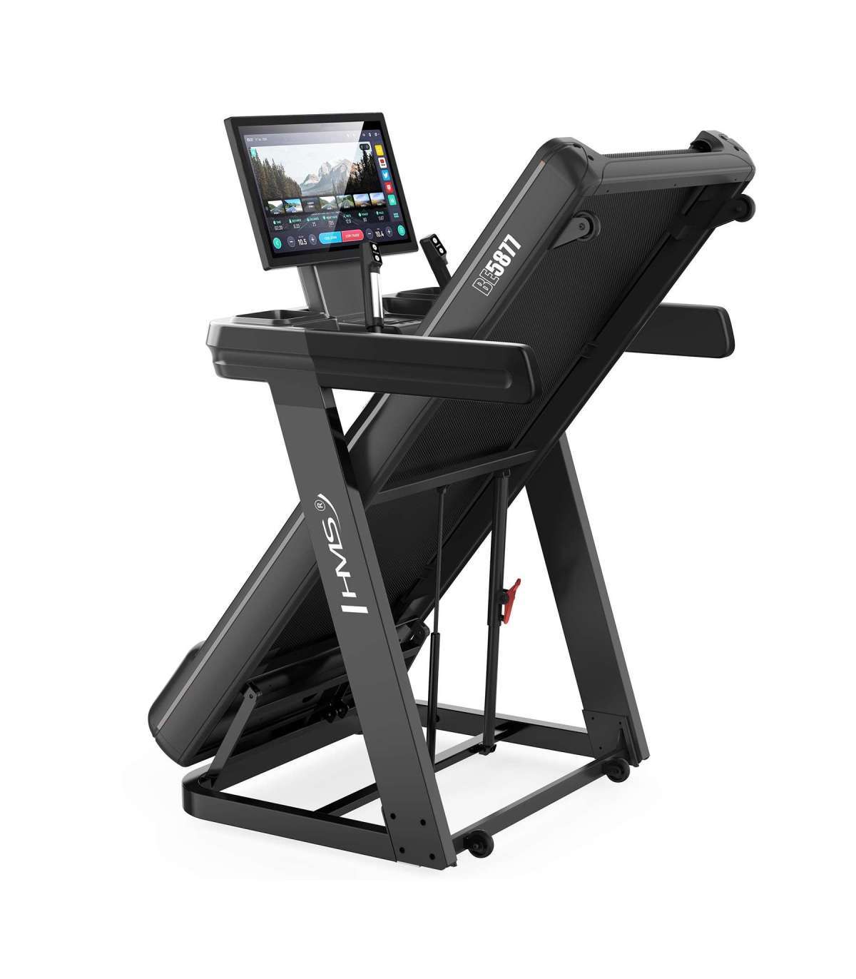 BE5877 ELECTRIC TREADMILL HMSThe BE5877 treadmill is an advanced training device that combines a powerful motor, modern technology and a rich selection of multimedia features. Equipped with Android, incline angle adjustment, WiFi and inductive charging, it provides not only an excellent workout but also a fully entertaining and interactive experience.Powerful motor and wide speed rangeThe BE5877 is equipped with a 3.0 HP constant power and 4.5 HP peak power motor, ensuring stable and smooth operation even during intense workouts. With an adjustable speed range of 1-22 km/h, the treadmill is perfect for both light marches and dynamic sprints.Realistic incline for maximum effectThe machine offers 15 incline levels, with a maximum angle of 7.8°, allowing you to effectively engage more muscles and increase the intensity of your workout. The adjustability makes the BE5877 great at simulating natural running conditions in the field.Advanced computer and interactive featuresThe treadmill allows you to monitor time, distance, speed, calories burned, pulse and body fat levels. With 40 training programmes, including 36 preset and 4 Real Scene programmes, users can virtually run on realistic trails, making training even more motivating.Android and full connectivityThe equipment is equipped with an Android system and a WiFi module, which allows you to use popular applications directly on the treadmill screen. Installed Chrome, YouTube, Spotify, Facebook, Instagram, Netflix, Twitter (X) and AirPin Lite give access to entertainment and motivational content during training.Inductive charging and multimediaThe treadmill has an inductive charger so you can conveniently charge your smartphone without the need for cables. The built-in speakers allow you to play your favourite music directly from the treadmill, and the large multimedia panel provides convenient access to all functions.Modern backlighting - intuitive control of treadmill operationThe electric treadmill is equipped with a sleek illumination system that not only emphasises its modern design, but also provides information on the running status of the machine. A green light indicates that the treadmill is plugged in and ready for use. When activated, the illumination changes to an energetic red, indicating that the machine is actively running. When the treadmill is unplugged, the illumination goes out completely, giving it a minimalist look.Safety and comfortThe BE5877 is equipped with touch sensors to measure your heart rate during your workout and a safety key that instantly stops the treadmill if needed. In addition, the treadmill has a folding feature for easy storage and transport wheels allow it to be easily moved.Full control over your workoutWith state-of-the-art solutions, full interactivity and powerful components, the BE5877 treadmill provides a professional running environment anywhere. The combination of training and multimedia functions makes every session more effective and enjoyable. If you are looking for a treadmill that will not only provide you with a great workout, but also entertainment - the BE5877 is the perfect choice!Specification:Dimensions of the treadmill (unfolded)