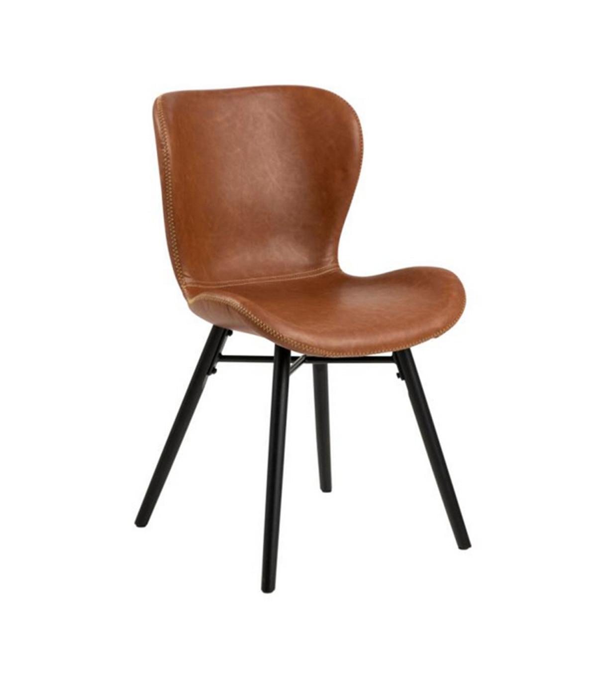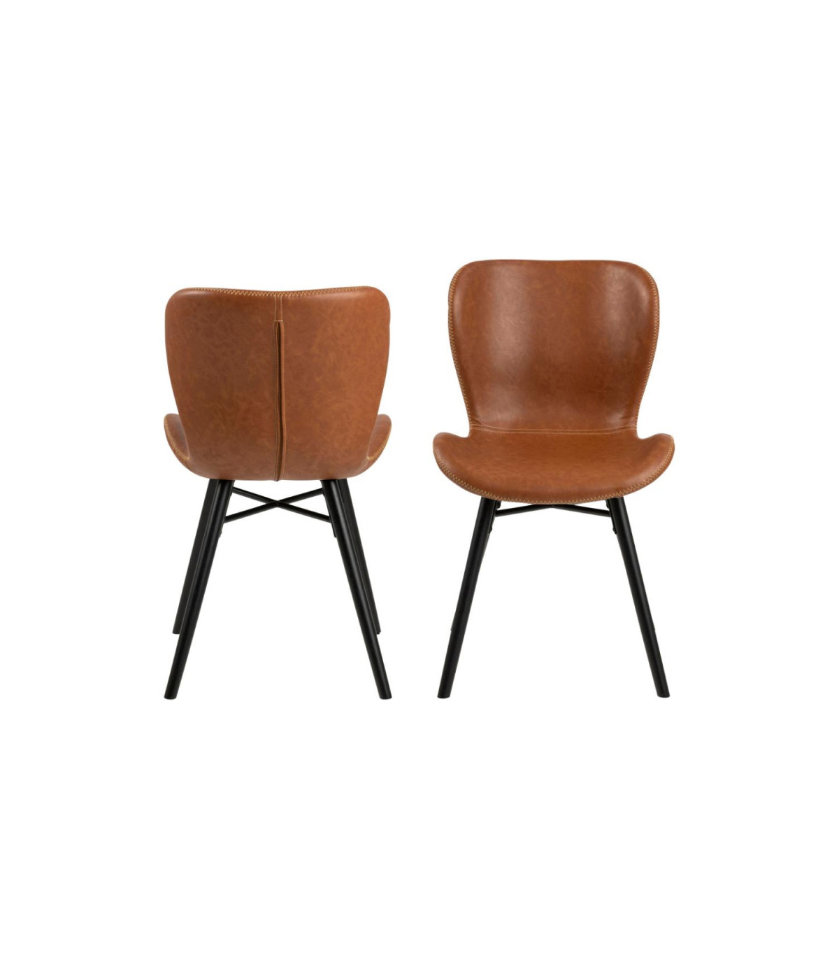 Tool BATILDA 47x56xH82,5cm, iste/seljatugi: kunstnahk, värvus: retro brandy PU691-B, jalad: kummipuu, värvus: must. Istme kõrgus 46,5cm, tooli äärtes on sik-sak õmblus, must metallist ristraam tooli all. Kaalupiirang: 110kg.