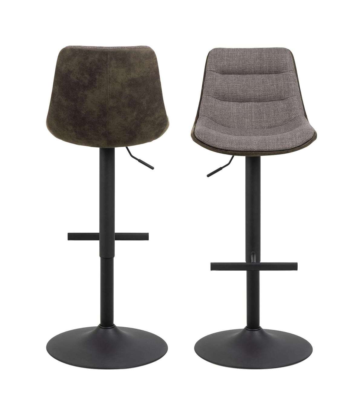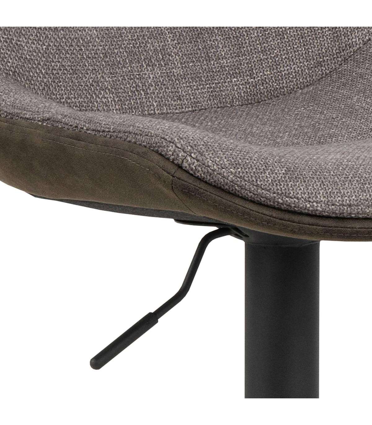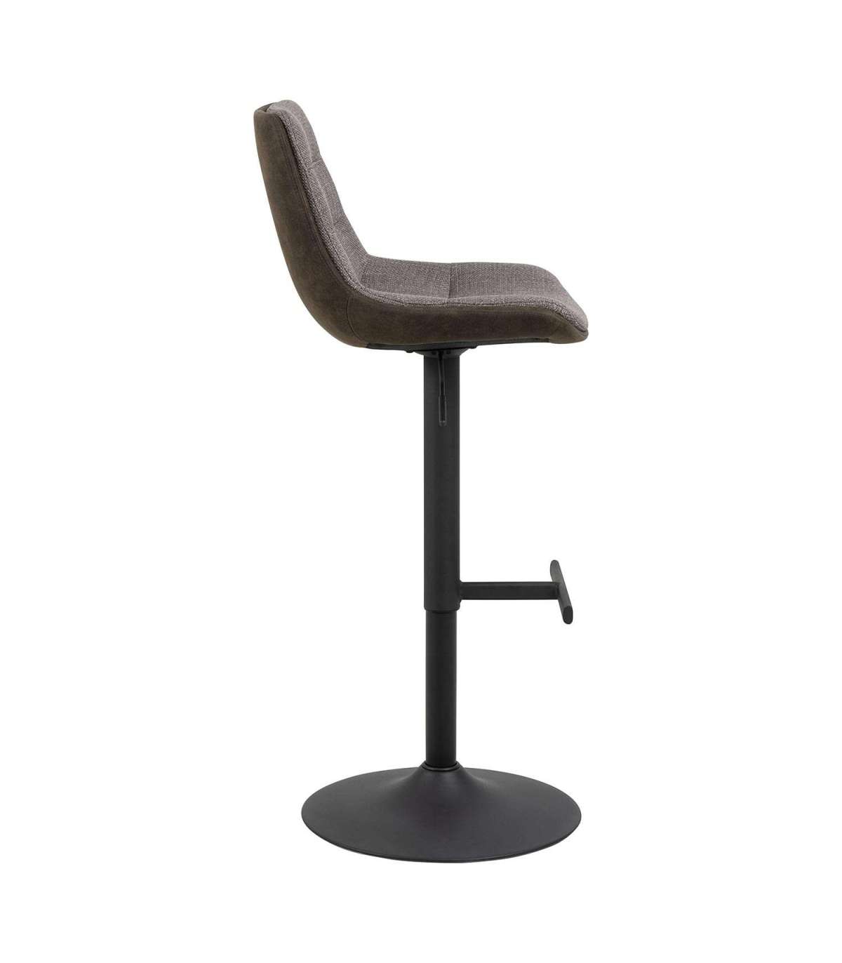 Mikrokiudkangaga polsterdatud baaripukk. Kahes toonis hallikaspruun kangas. Horisontaalsete õmblusdetailide ja pöörlemisfunktsiooniga. Must pulbervärvitud metallist trompetialus koos jalatoega. FSC™ sertifikaat. Mõõdud 47x52,5xH95cm.