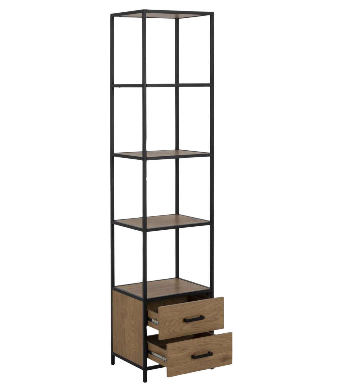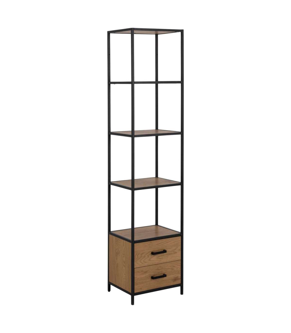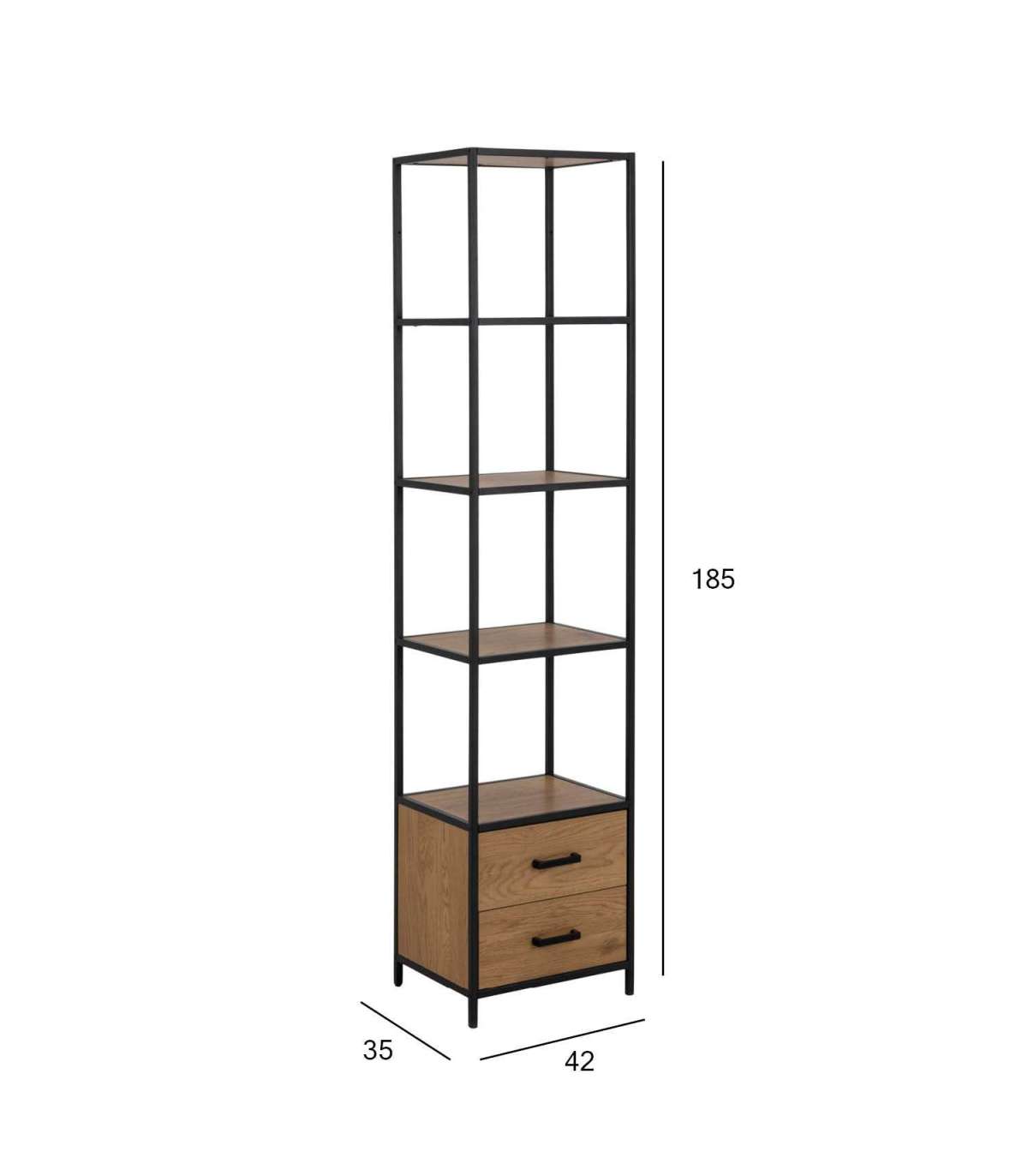 Raamaturiiul pakub nii hoiuruumi kui toob ruumi ka moodsat industriaalset hõngu. Sellel on 3 riiulit ja 2 sahtlit. Riiul on ideaalne aktsent igasse ruumi, lisades sellele stiilsust. Riiulil on isikupära, mis sobib paljude interjööridega. Raamaturiiulil on silmatorkav metsiku tamme välimus ja must metallalus pulbervärvitud viimistlusega. Materjale on lihtne hooldada. Mõõdud on 42x35xH185cm.