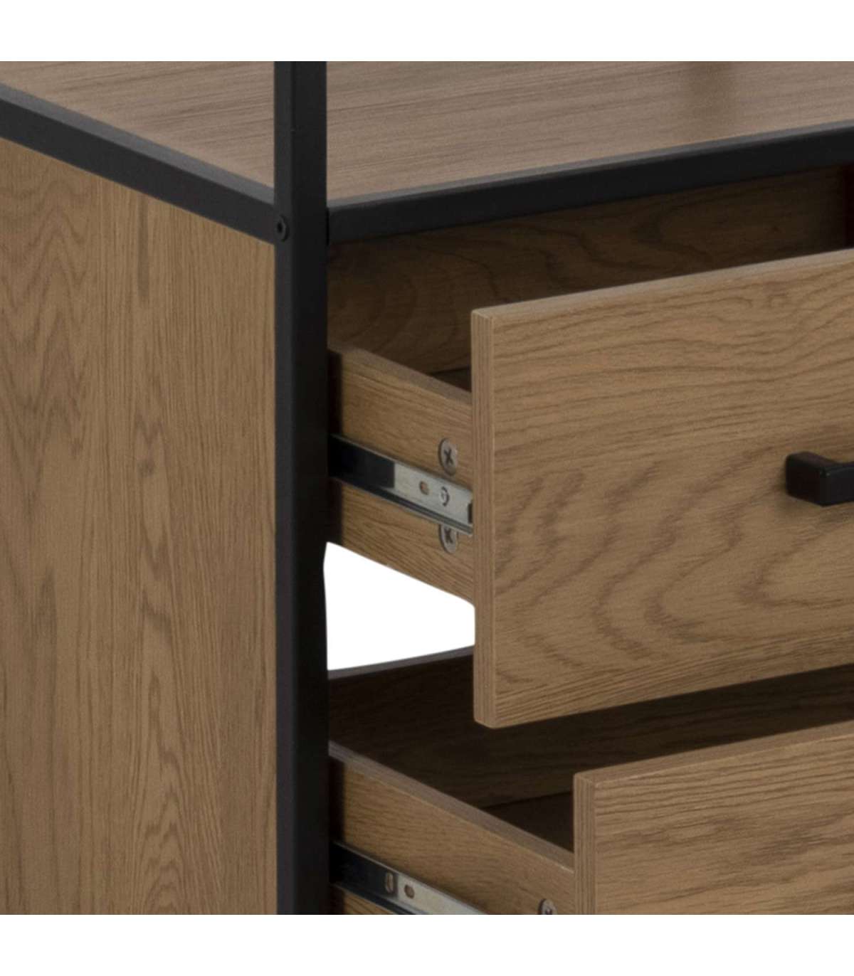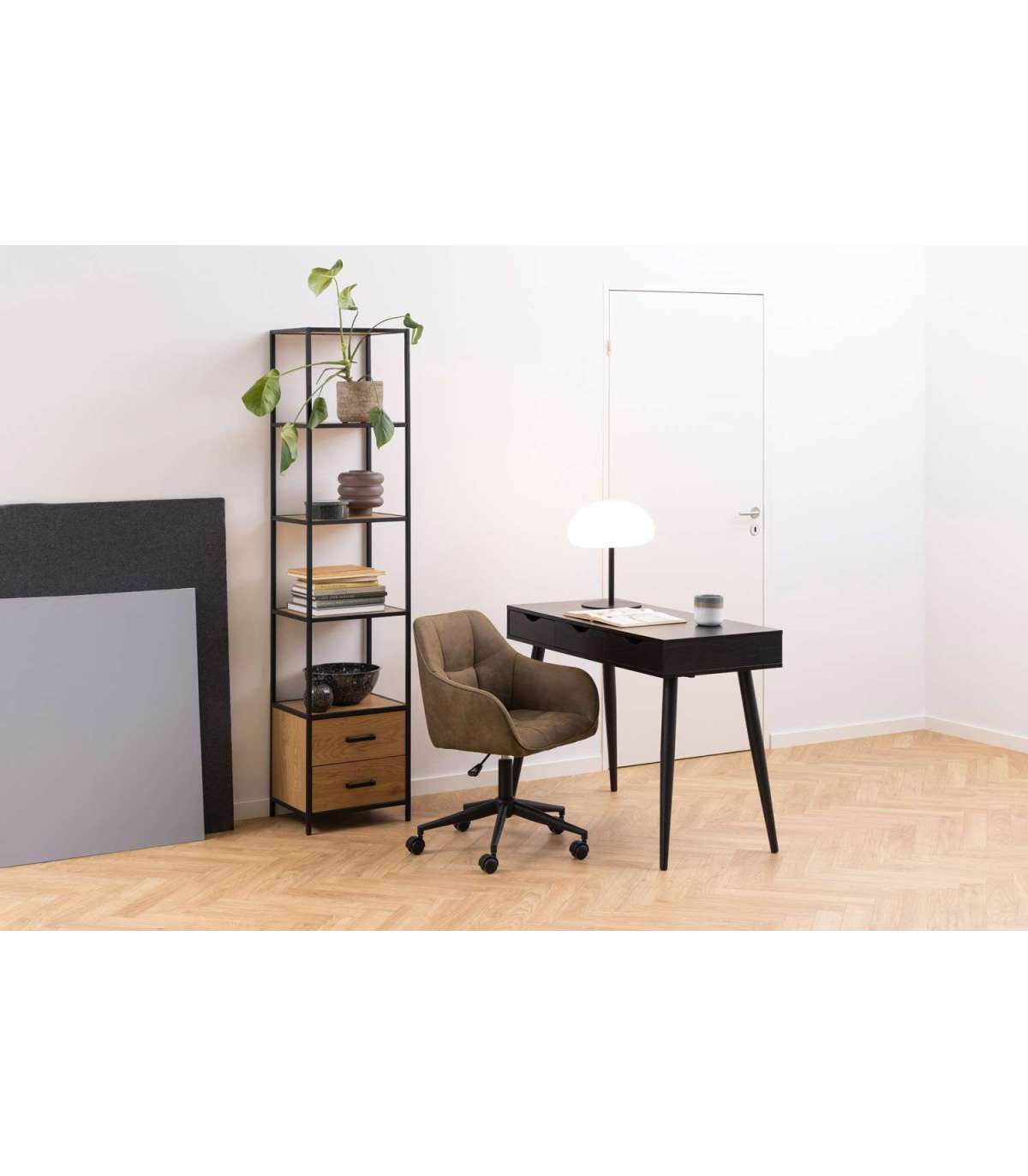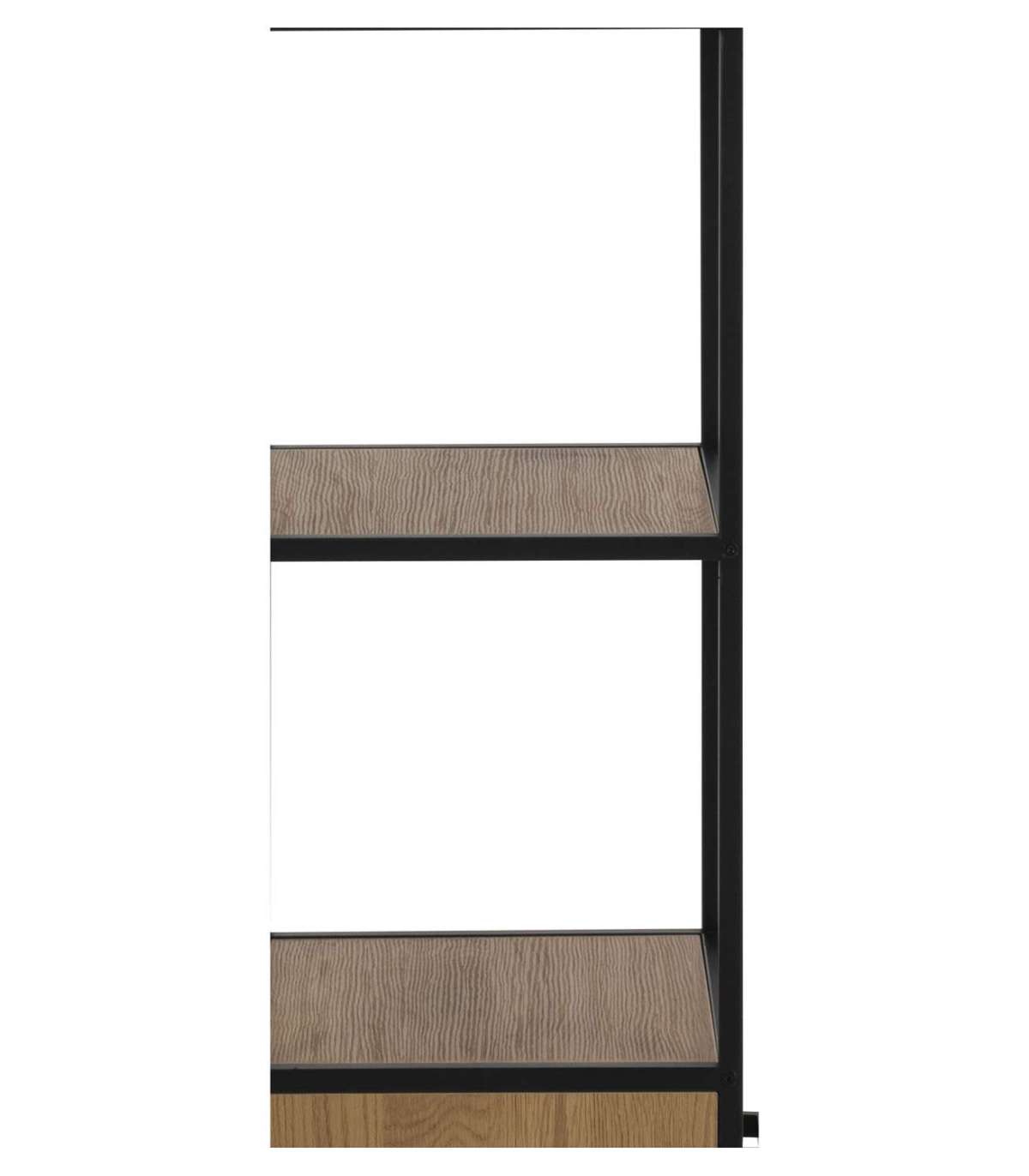 Raamaturiiul pakub nii hoiuruumi kui toob ruumi ka moodsat industriaalset hõngu. Sellel on 3 riiulit ja 2 sahtlit. Riiul on ideaalne aktsent igasse ruumi, lisades sellele stiilsust. Riiulil on isikupära, mis sobib paljude interjööridega. Raamaturiiulil on silmatorkav metsiku tamme välimus ja must metallalus pulbervärvitud viimistlusega. Materjale on lihtne hooldada. Mõõdud on 42x35xH185cm.