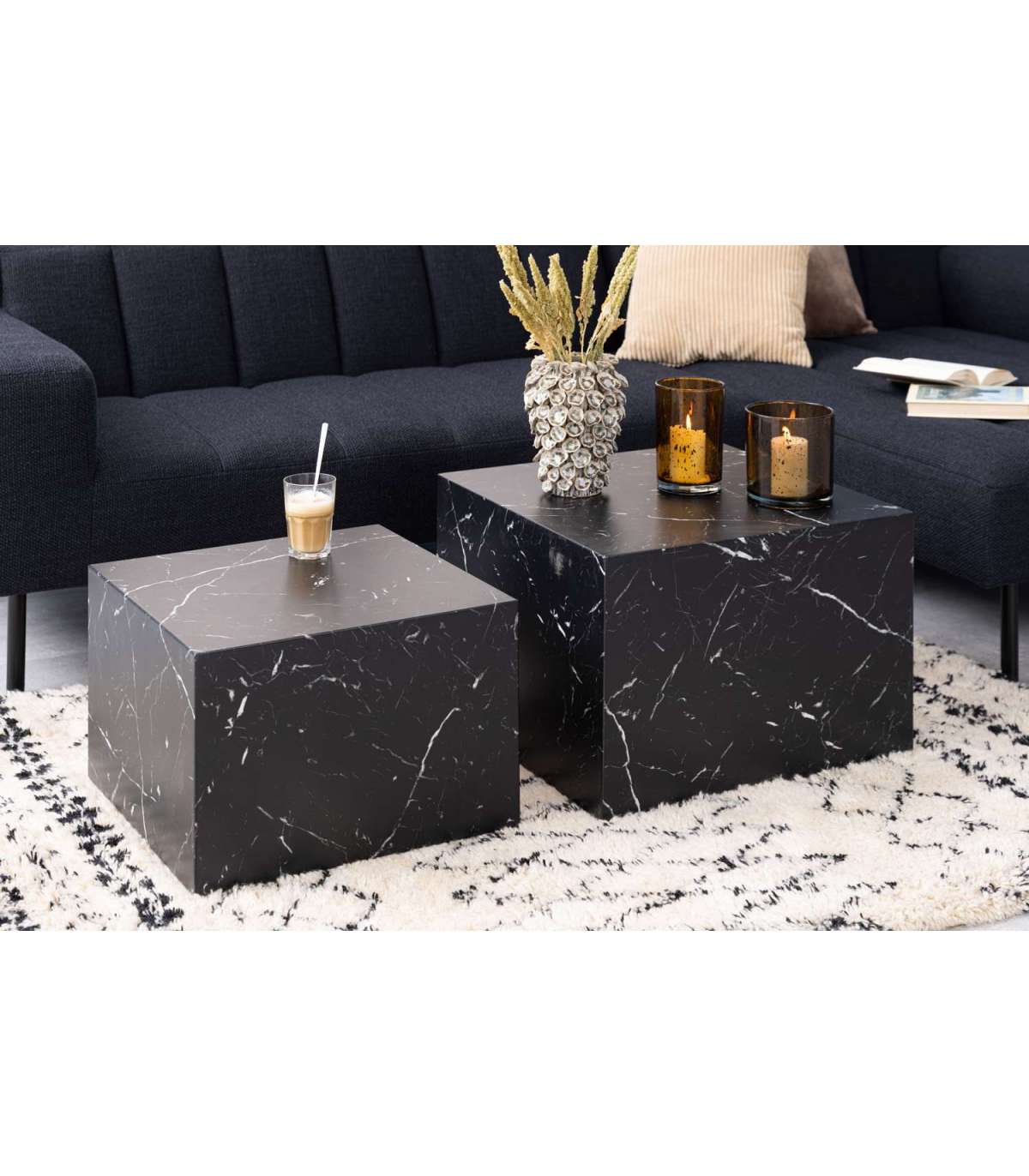 See kohvilaudade komplekt toob teie elutuppa isikupära. Ruudukujuline vorm ja marmorist välimus – need tõmbavad kindlasti tähelepanu. Kasutage kohvilauana või asetage nurka, kasutades lillepoti või vaasi alusena. HOOLDUS: Kasutage seebivees tugevasti väänatud lappi ja pühkige see kindlasti kuivaks. Vältige küürimispulbri või nailonkäsnade kasutamist, kuna need pleegivad või kriimustavad materjali.
