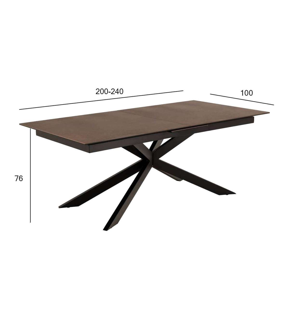 Praktiline tööstusliku ilmega söögilaud. Kuumus- ja kriimustuskindel roostepruun keraamiline lauaplaat. Keraamiline pikendusplaat. Must pulbervärvitud ristalus. Pikendatuna mahutab mugavalt 10 inimest. Toote mõõdud on 200/240x100xH76cm.