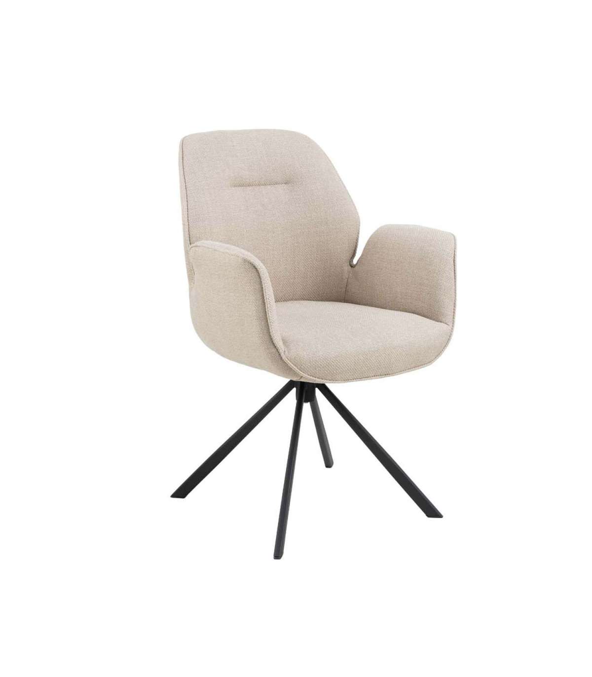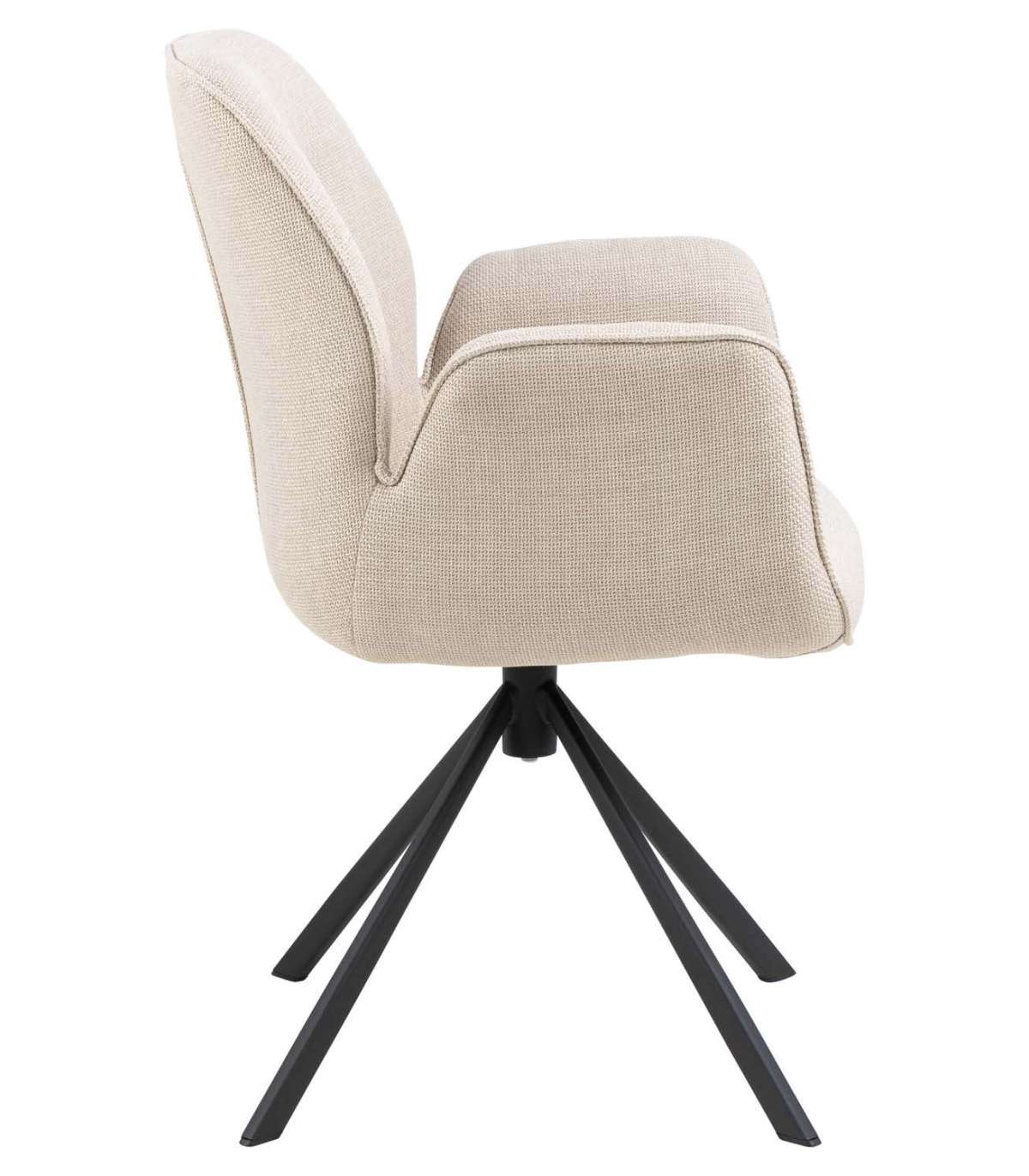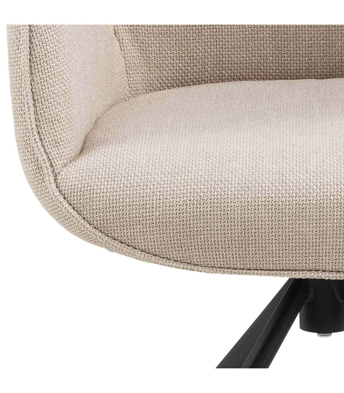 Iseloomuliku siluetiga ja moodsalt elegantne söögitool sobib suurepäraselt igasse kaasaegsesse koju. Iste on polsterdatud kahetoonilise efektiga beeži kangaga, mis annab tekstuurse välimuse. Käetugede ja seljatoe vahel on lõige. Tooli moodsat ilmet rõhutab must metallist alus, millel on pöörlev funktsioon. Mõõdud 60,5x58,5xH91cm.