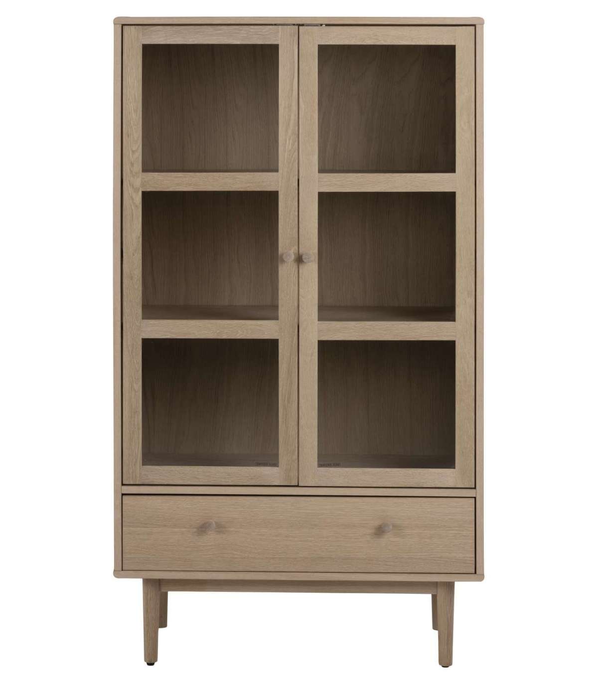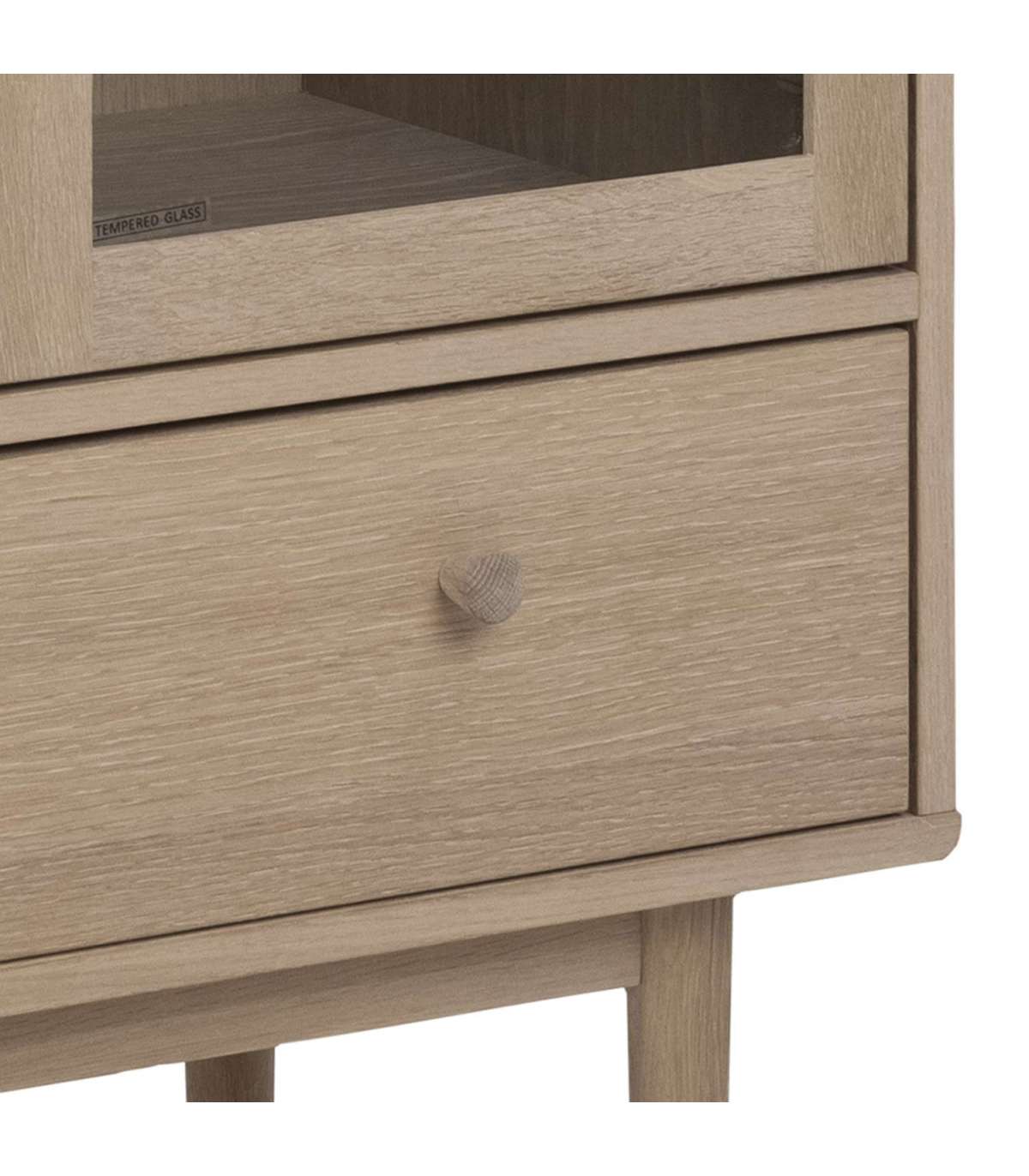 Täistammest ja tammespoonist valmistatud vitriinkapp on ideaalne valik, kui olete klassikalise Skandinaavia disaini austaja. Klaasuste taga on 2 vitriinriiulit, mis jätavad sahtli vabaks väiksemate esemete jaoks. Reguleeritavad riiulid vastavalt teie vajadustele, iga riiuli kaalumisvõime on 15kg. HOOLDUS: kõik plekid tuleb koheselt eemaldada niiske lapiga. Klaasialused ja lauamatid aitavad vältida pinnakahjustusi.