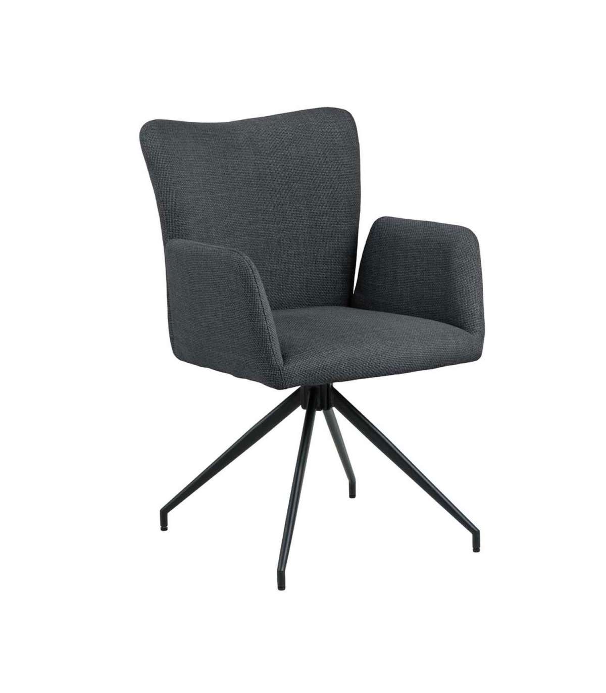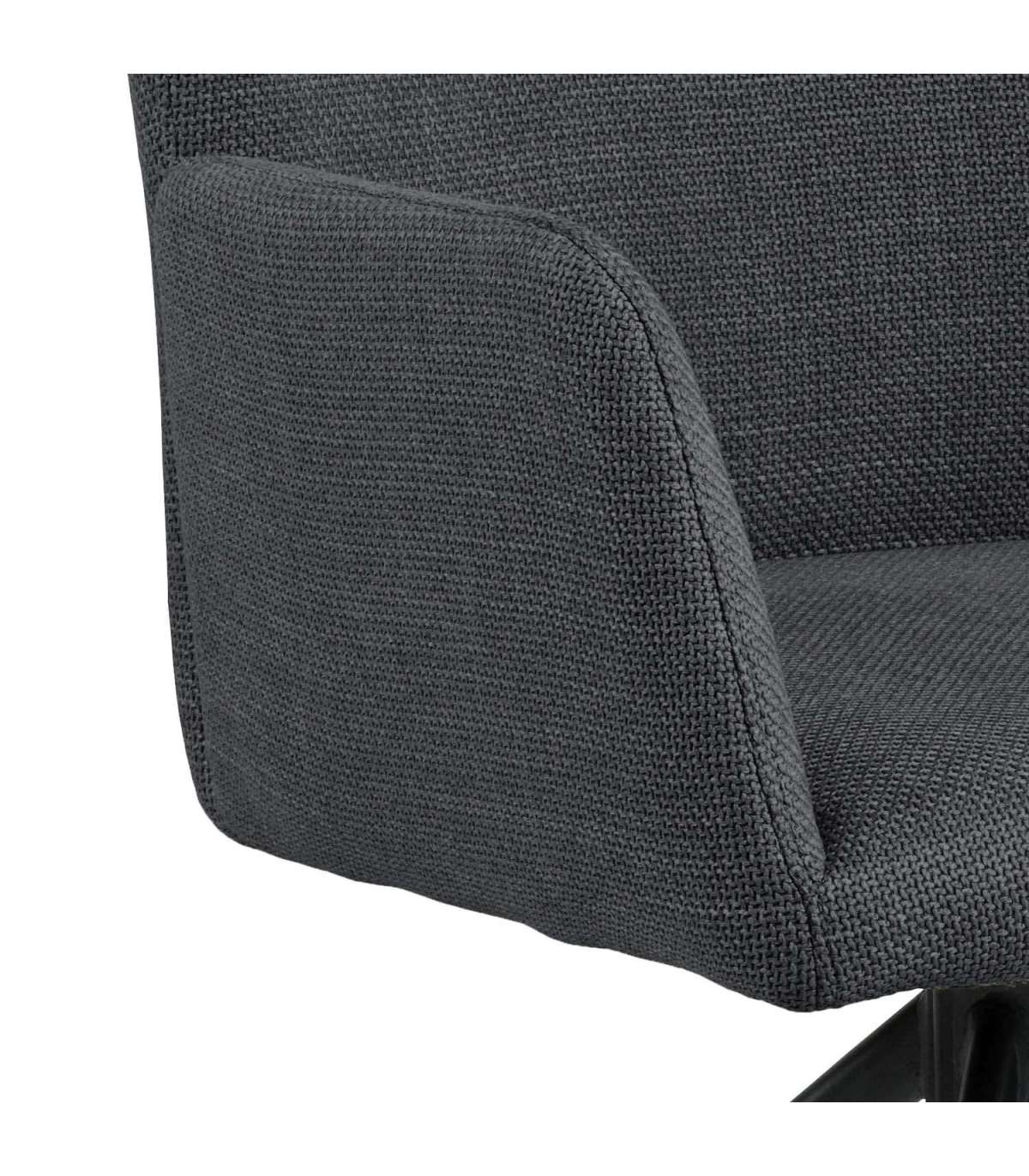 Stiilsel söögitoolil on elegantne siluett. Orgaanilise kujuga istmel on iseloomulikud lõiked seljatoe ja käetugede vahel, mis lisavad toolile stiilse nüansi. Tool on kaetud tumehalli kahevärvilise efektiga kangaga, mis annab tekstuuri ja sügavuse. Pöörleva funktsiooniga aluse abil saab tooli sujuvalt ja hõlpsalt pöörata. Tool sobib eriti hästi kaasaegsetesse söögitubadesse. Mõõdud on 57x61,5xH86cm.