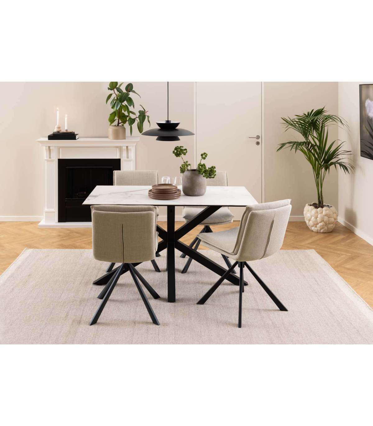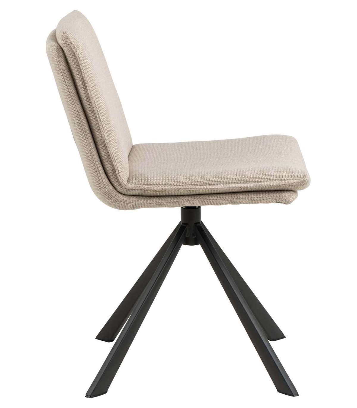 Kaasaegne söögitool. Õmmeldud padjaga iste. Padjal dekoratiivsed õmblused. Polsterdatud kahetoonilise efektiga beeži kangaga. Must pulbervärvitud alus, pöörlev. Toote mõõdud on 47x59xH85cm.