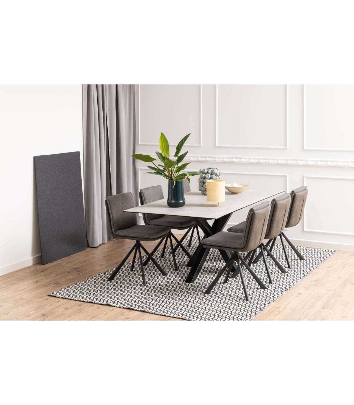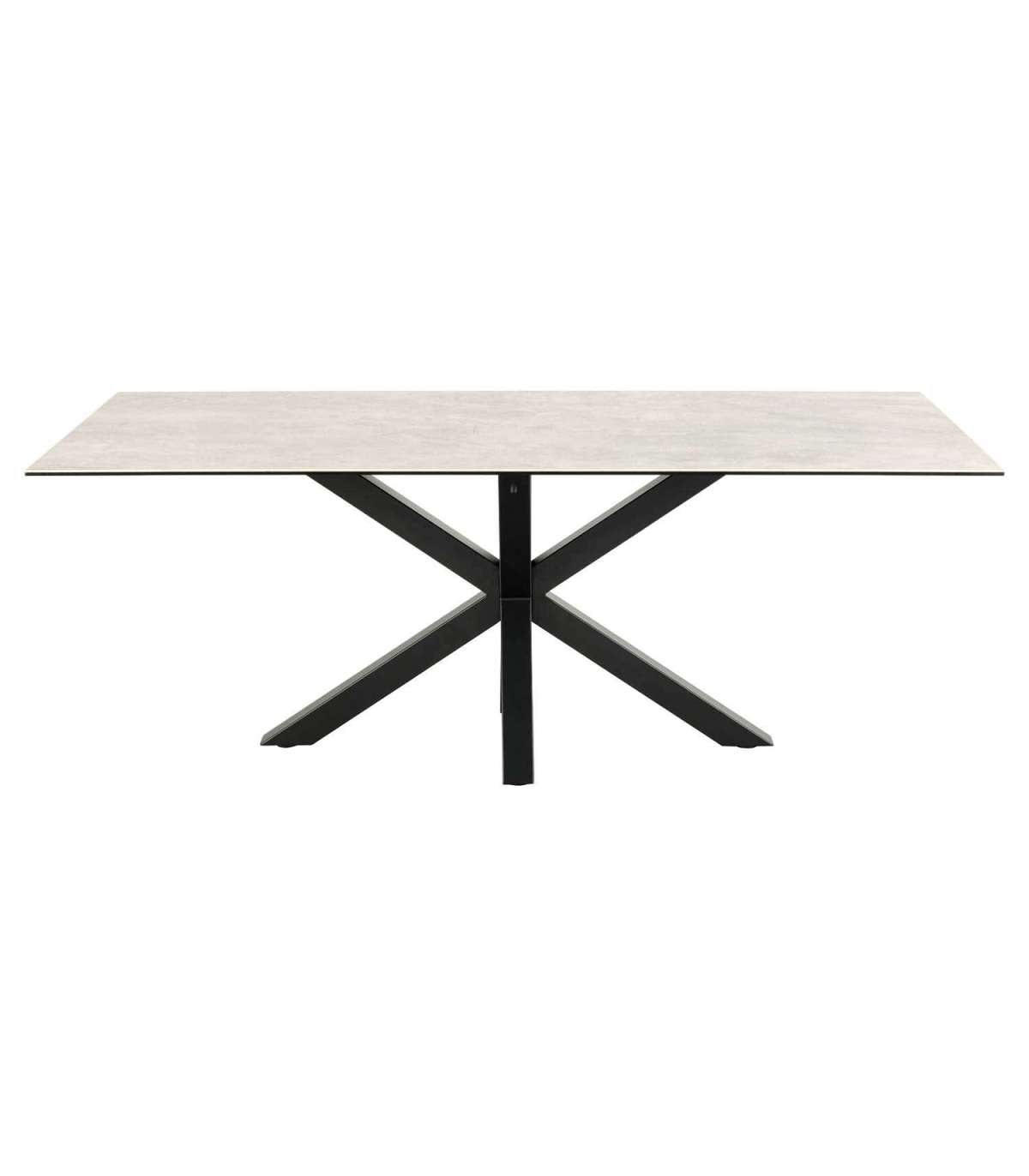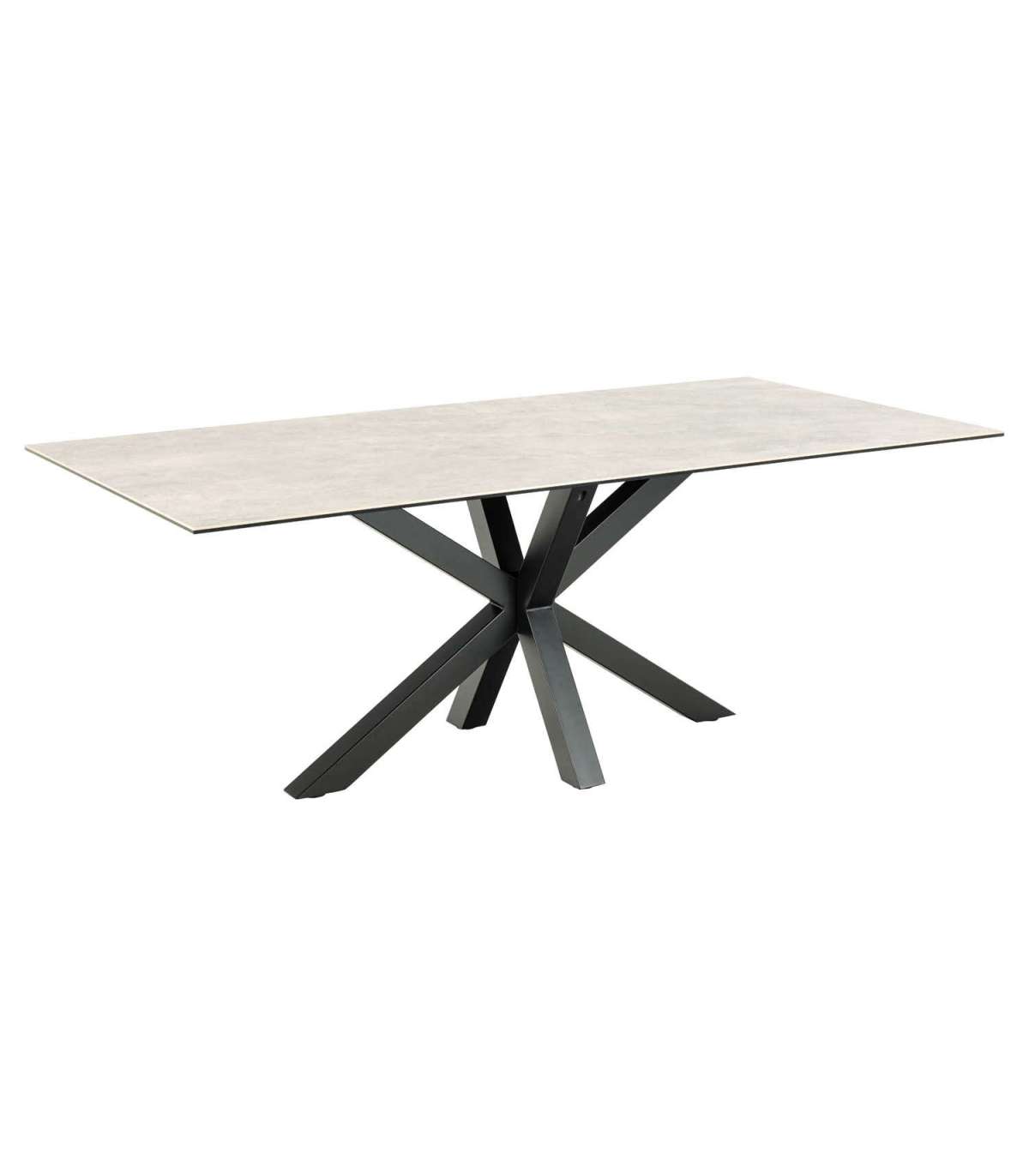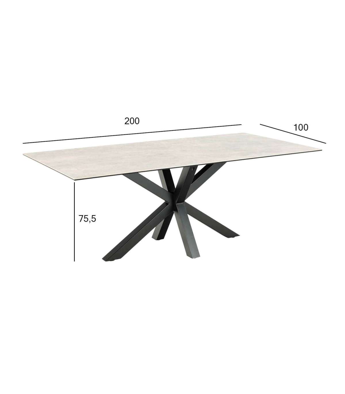 Kaasaegne julge välimusega söögilaud. Laua hallid toonid annavad sellele karge ilme. Lauaplaat on valmistatud kuuma- ja kriimustuskindlast keraamikast. Must skulptuurne metallist ristalus tagab stabiilsuse. Mahutab mugavalt 8 inimest. Toote mõõdud on 200x100xH75,5cm.