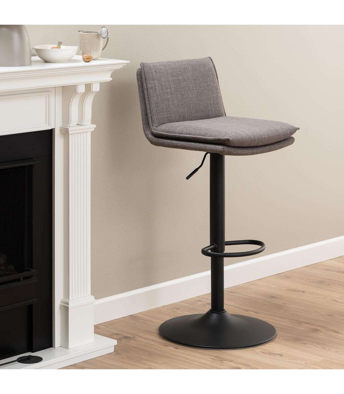 Elegantne rafineeritud detailidega baaripukk. Polsterdatud kahes toonis hallikaspruuni kangaga. Must pulbervärvitud metallist trompetalus jalatoega. Gaasitõstuk ja pöörlemisfunktsioon. Istme kõrgust saab reguleerida vahemikus 68cm kuni 89cm. Mõõdud 44x53xH107cm.