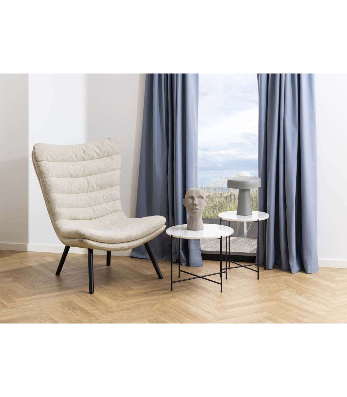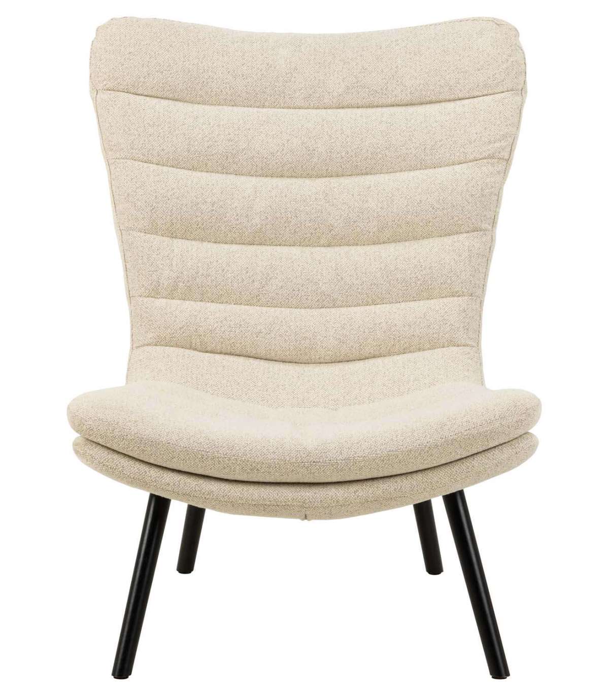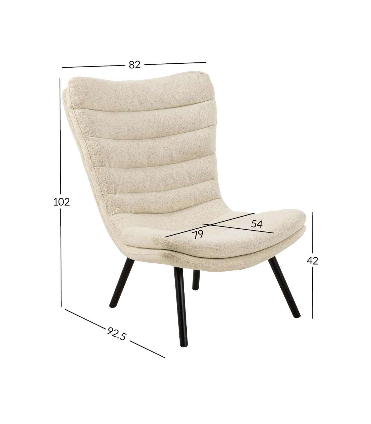 Põhjamaise disainiga puhketool. Madal iste ja kumer lai seljatugi muudavad tooli eriti mugavaks. Pehme bukleekangas annab toolile eksklusiivse välimuse. Toolil on horisontaalsed õmblused. Lakitud musta värvi jalad. Toote mõõdud on 82x92,5xH102cm.