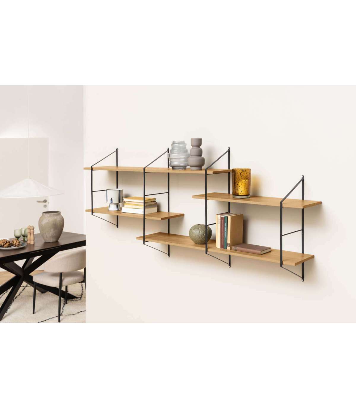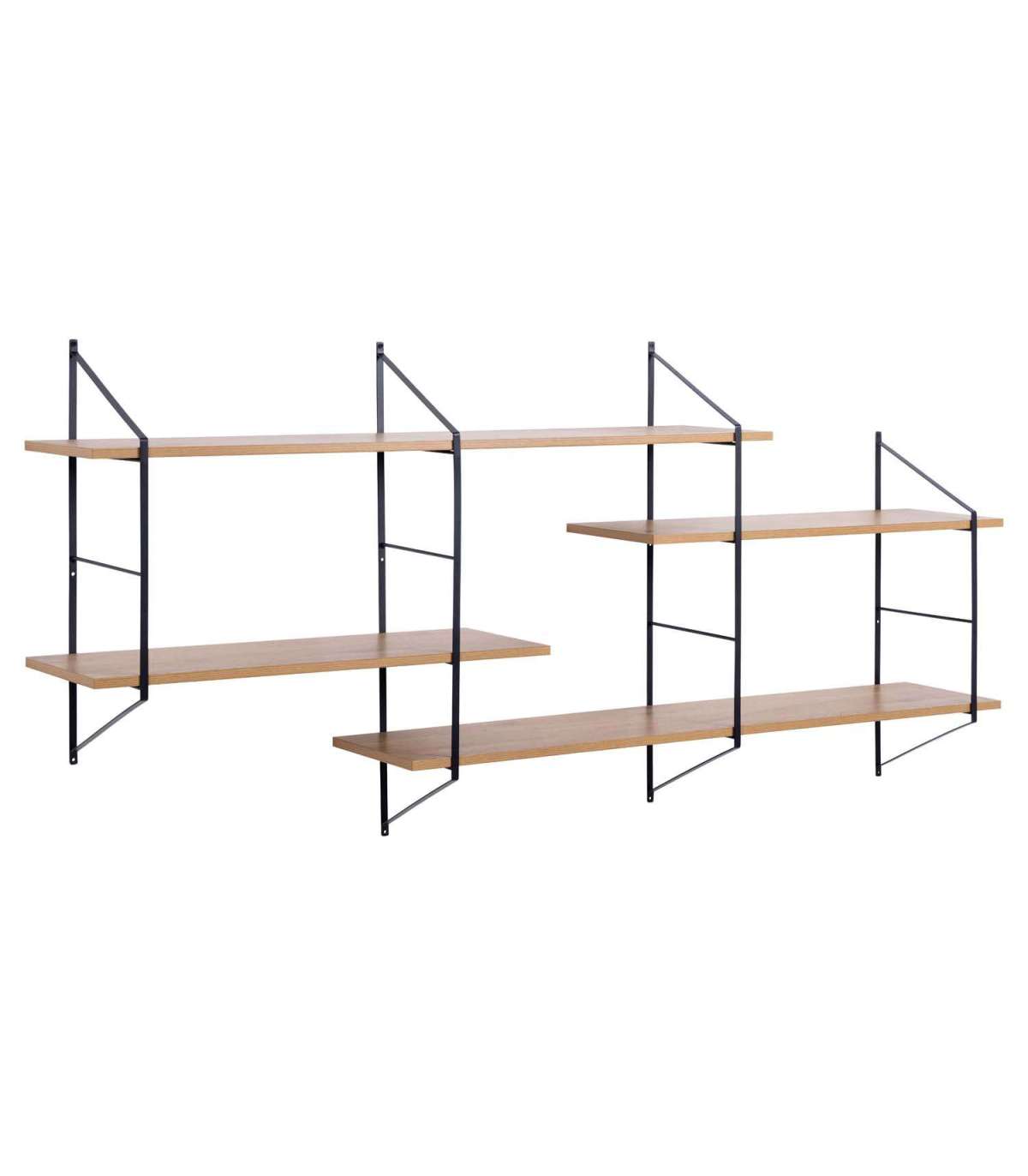 Moodne kerge ilmega seinariiul. Inspireeritud tööstusliku ja japandi stiili segust. Asümmeetriline detail lisab visuaalset huvitava nüansi. 4 reguleeritavat tamme välimusega riiulit. Peen must pulbervärvitud metallraam. FSC™ sertifikaat. Toote mõõdud on 191x25,5xH79cm.