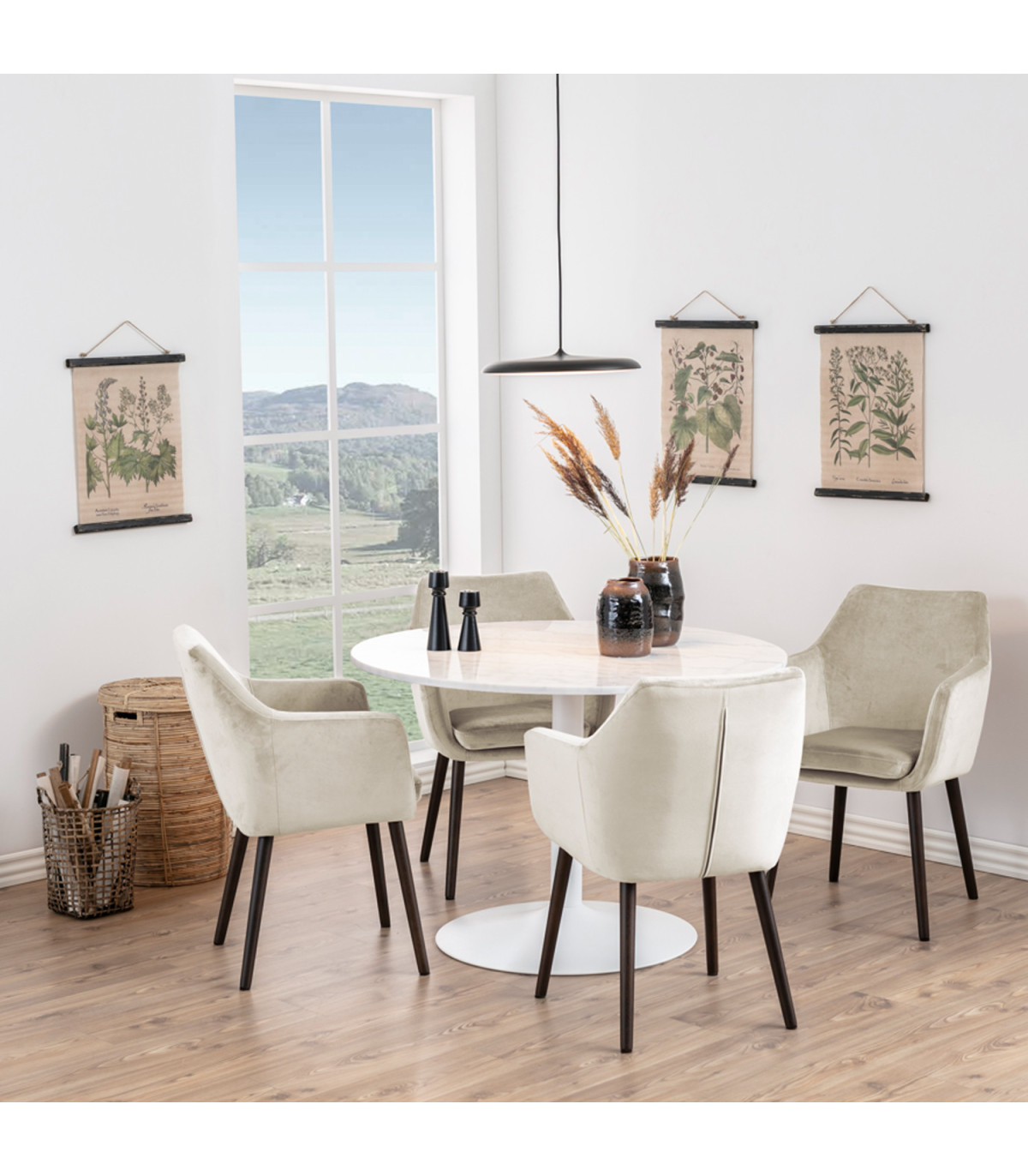 Peen söögitool muudab iga einestamise erilisemaks. Toolil on kitsenevad jalad, vertikaalsed õmblused, pehme polster ja mugavad käetoed. Kaunis sametkangas on iseloomuliku pehme tunnetusega. Tänu sametile võib värv muutuda olenevalt valgusest ja suunast, andes kangale elava ja rikkaliku ilme. Kaalupiirang: 110kg. Mõõdud 57x59xH83cm.