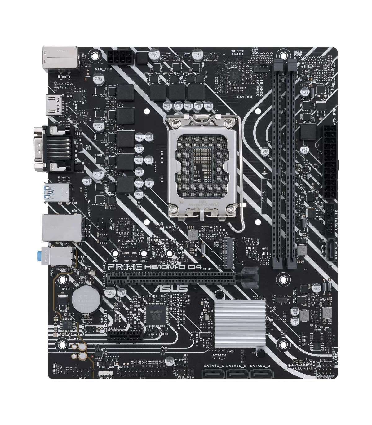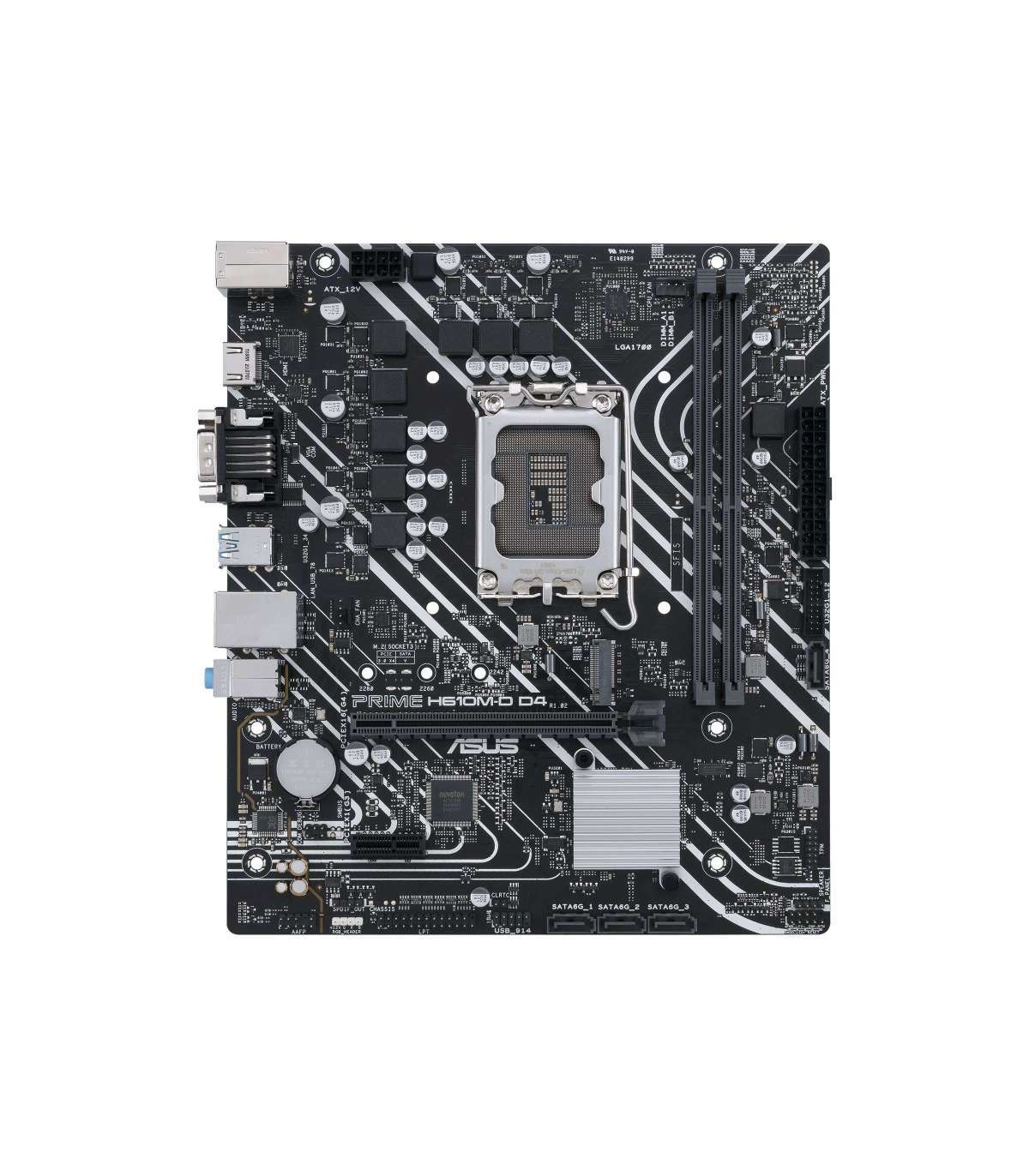 Asus | PRIME H610M-D D4 | Processor family Intel | Processor socket LGA1700 | DDR4 DIMM | Memory slots 2 | Supported hard disk drive interfaces SATA, M.2 | Number of SATA connectors 4 | Chipset Intel H610 | mATX