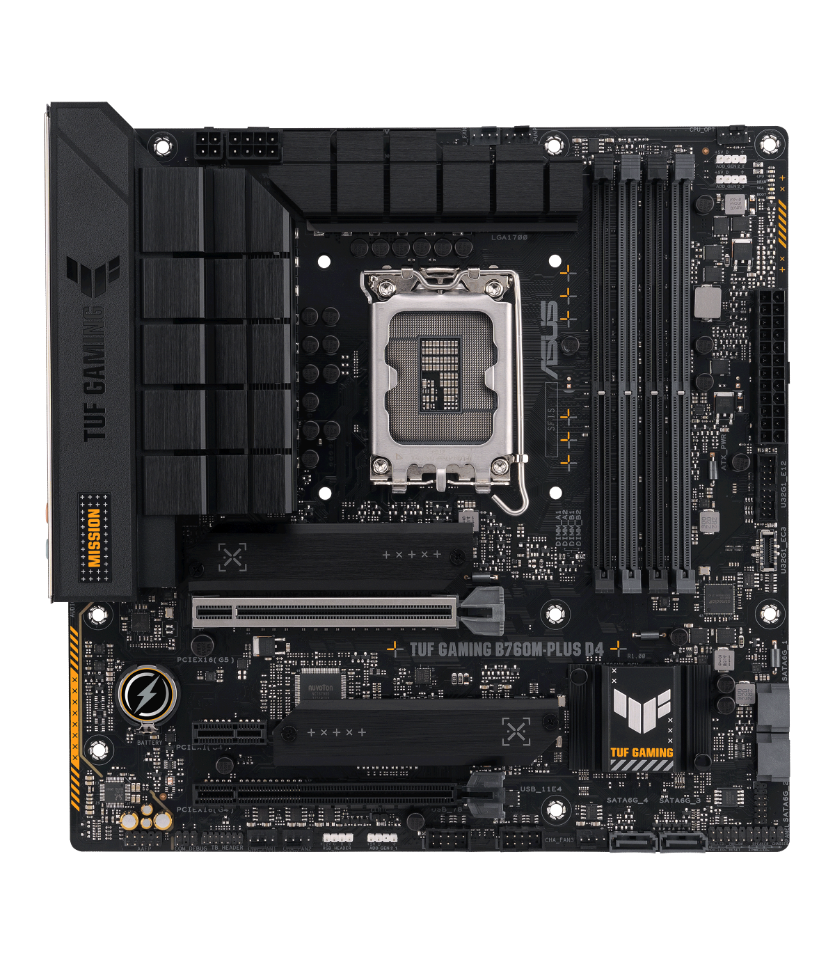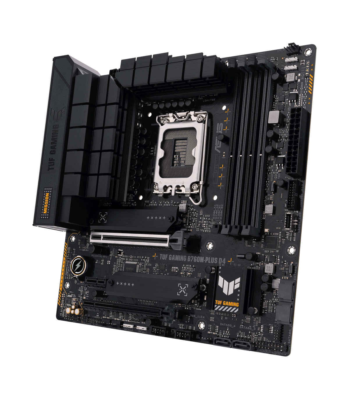 Asus | TUF GAMING B760M-PLUS D4 | Processor family Intel | Processor socket LGA1700 | DDR4 DIMM | Memory slots 4 | Supported hard disk drive interfaces SATA, M.2 | Number of SATA connectors 4 | Chipset Intel B760 | mATX
