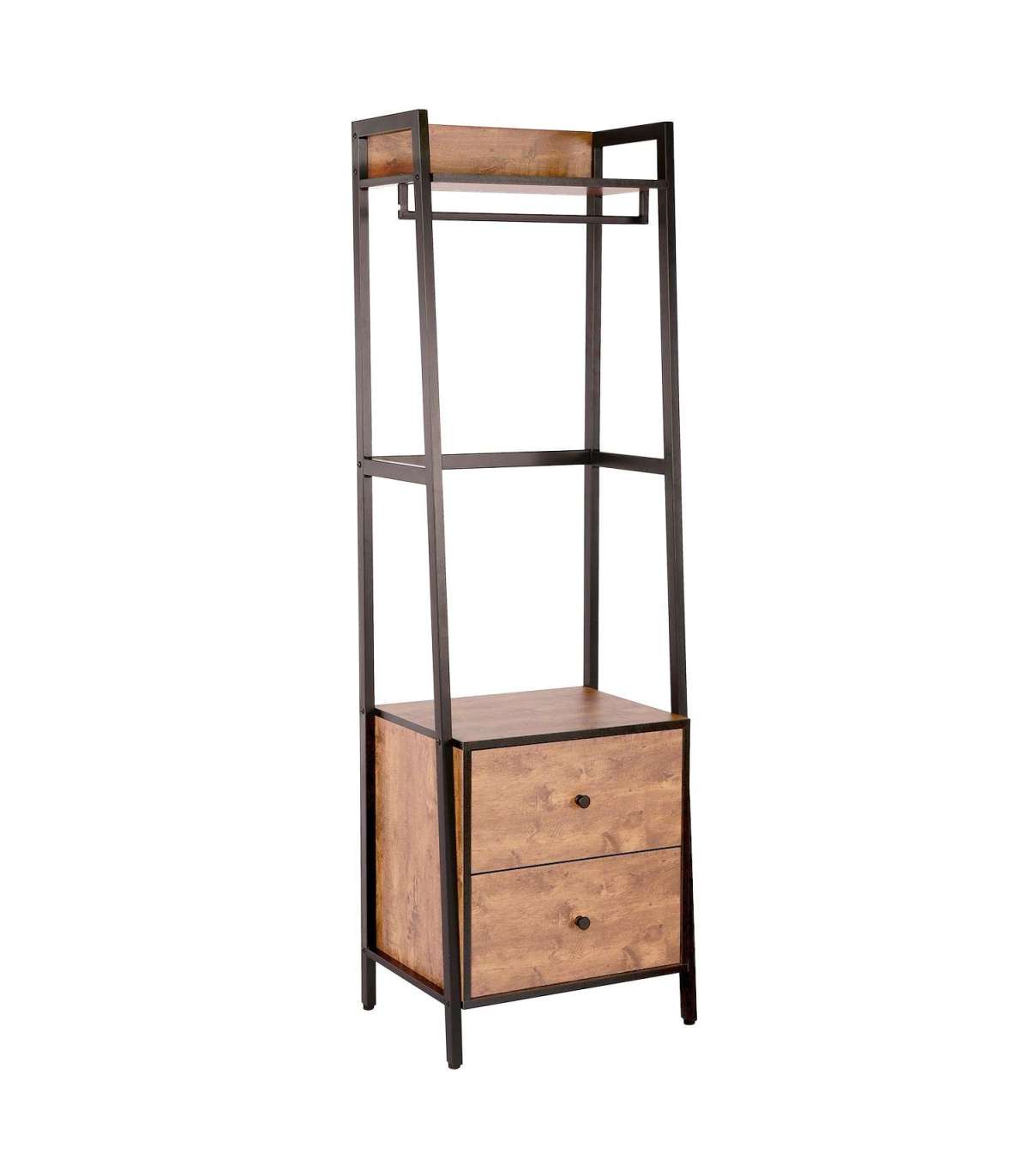 Esikuriiul LAVINIA 2-sahtli ja stangega 52x40xH169cm, saar/must. Riiuli raam on valmistatud metallist ja viimistletud musta pulbervärviga. Riiulid sahtlipaneelid on valmistatud saaredekooriga melamiinplaadist.
