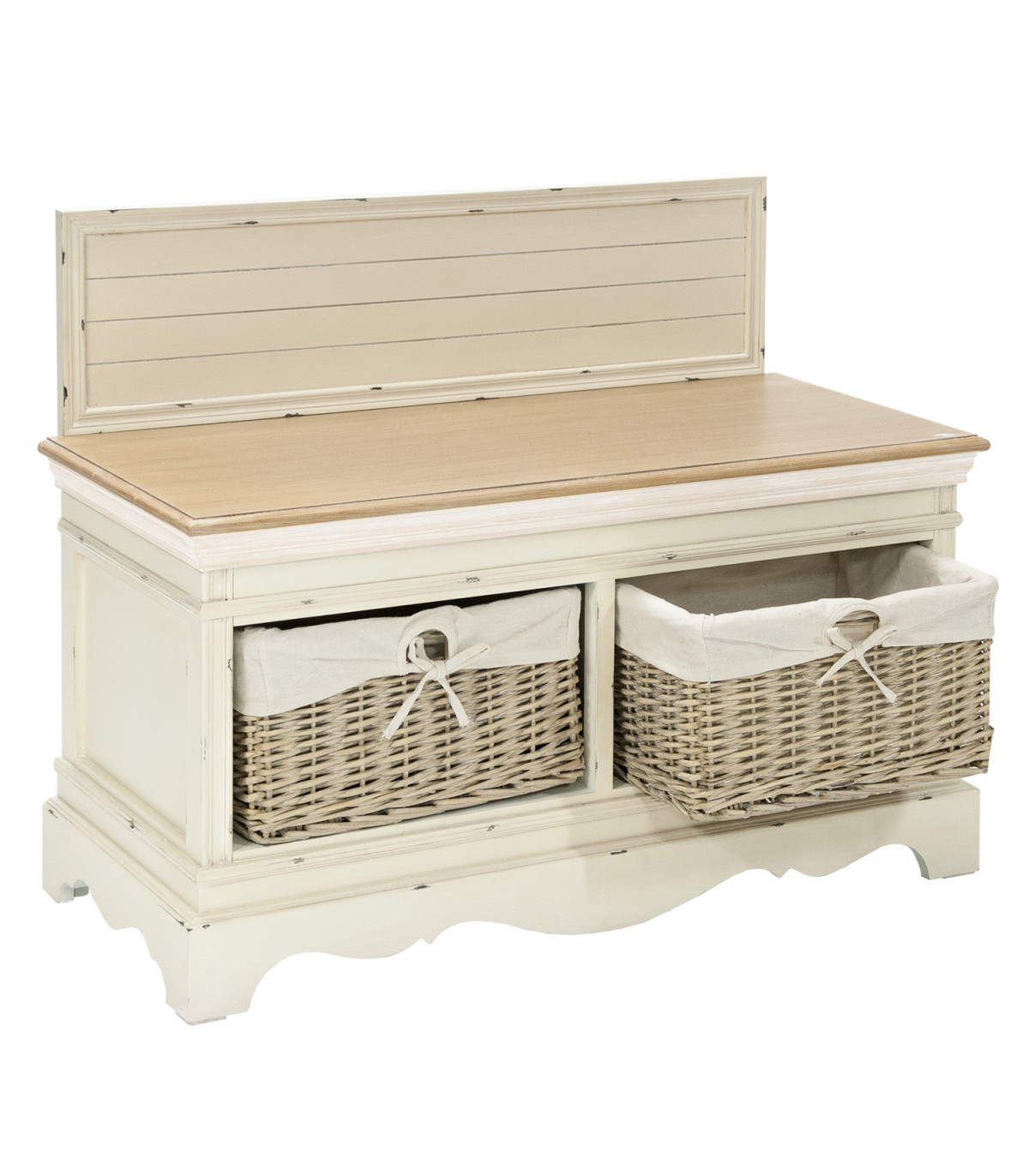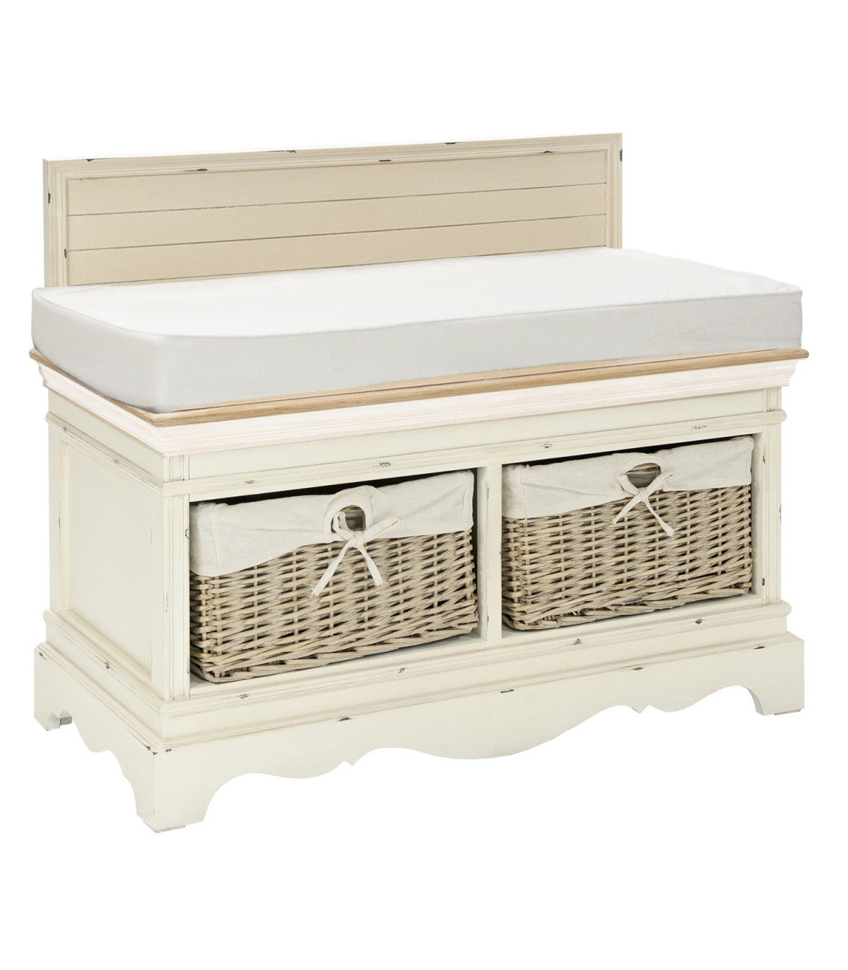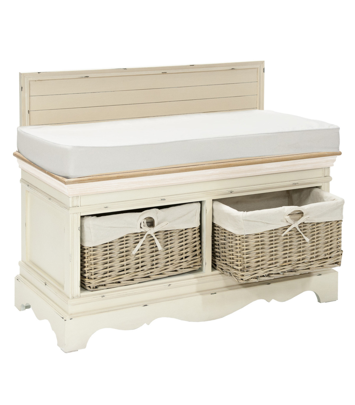 Esikupink SAMIRA korvsahtlitega 90x42x70,5cm, antiikvalge. Pingi korpus ja sokkel on valmistatud saarepuidust ja viimistletud antiikvalge värviga. MDF istmeplaat on kaetud naturaalse paulownia spooniga. Plaatproloonist istmepadi kuulub komplekti. Padja mõõdud on 40x88xH8cm. Padjakate on valmistatud heledast puuvillasest kangast. Istme all on kaks puuvillase kangaga vooderdatud korvsahtlit mõõtudega 30x37xH20cm.