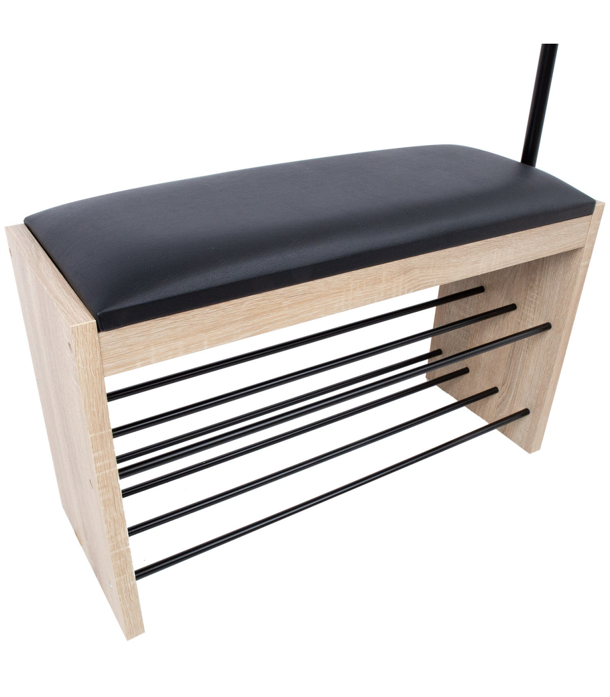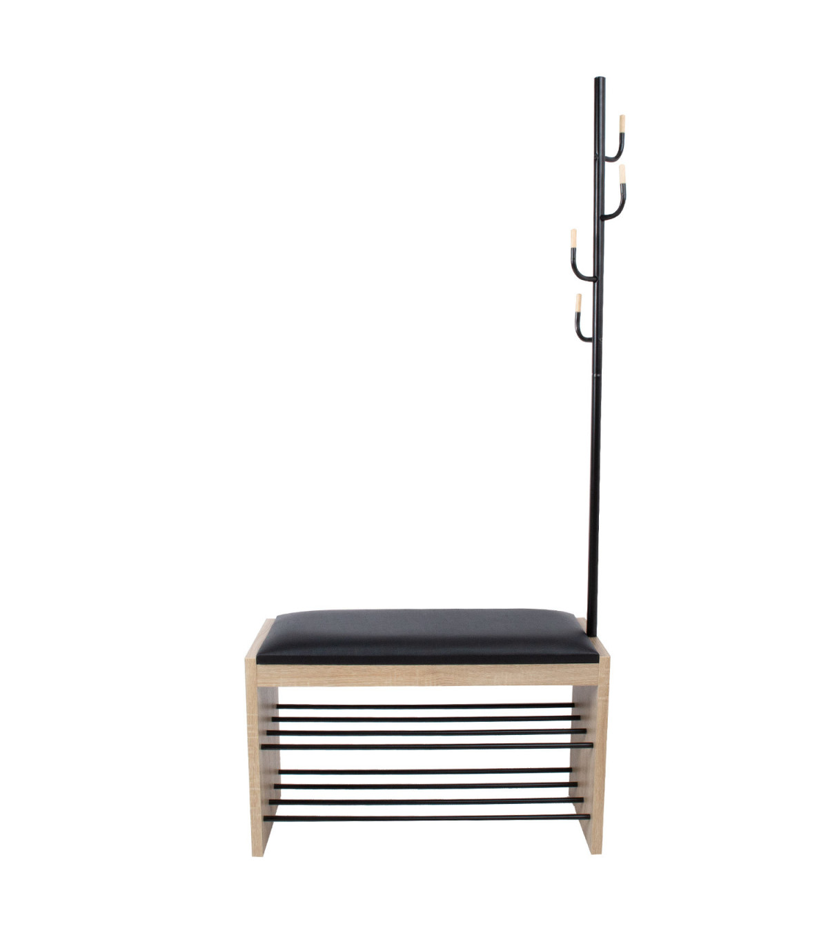 Esikuriiul BENO nagiga helepruun. Kompaktne ja funktsionaalne riiul sobib hästi esikusse ülerõivaste ning jalanõude hoiustamiseks. Riiuli muudab praktiliseks sinna juurde kuuluv pink. Iste on polsterdatud ning kaetud musta PVC materjaliga. Istme all on kaks riiulit jalanõude hoiustamiseks. Istme küljes on kõrge nagi rõivaste riputamiseks. Riiul on valmistatud tammedekooriga laminaatplaadist. Terastorud on kaetud musta pulbervärviga. Riiuli mõõdud on 87x30xH173cm.