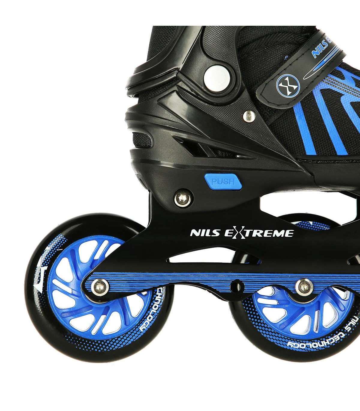 NA18812 Nils Extreme on rulluisude mudel, mis on mõeldud kiireks sõitmiseks. Kerge ja vastupidav kings, nöörimine pluss Velcro rihm ja klipp pakuvad ohutust, suurepärast stabiilsust ja tasakaalu sõitmisel. Lihtsa reguleerimissüsteemi abil saab suurust kiiresti ja lihtsalt jala järgi kohandada. Samet, kõrge tihedusega vaht, võrk ja ventilatsioonisüsteem suurendavad otse kasutaja mugavust. Rulluisud on varustatud spetsiaalse alumiiniumist libisemisega. Suured rattad ja ABEC9 klassi laagritest tingitud vähem rullimisvastupanu. Hea kvaliteediga laagrid ja väga suured rattad (100 mm) tagavad väga kiire sõidu.