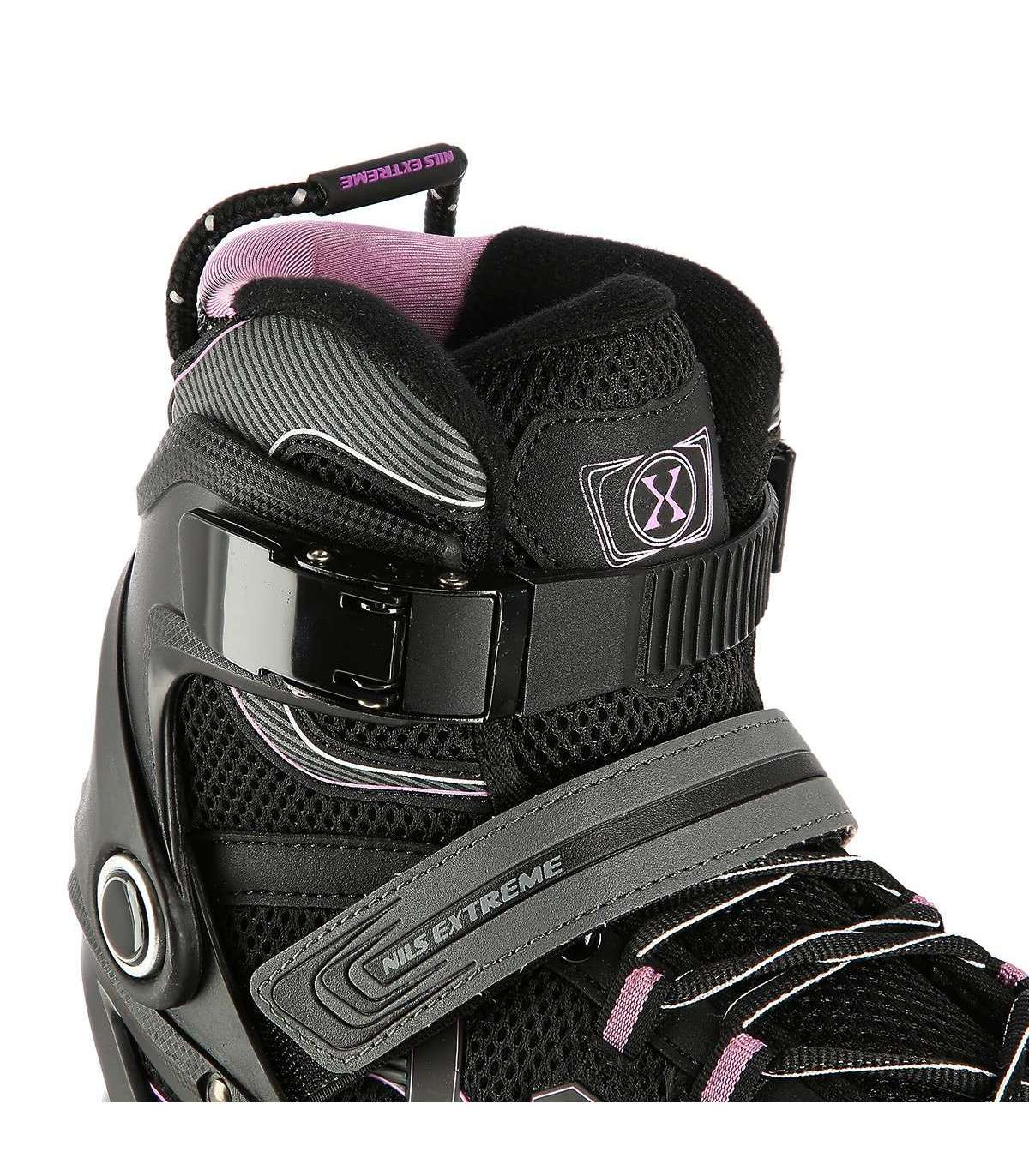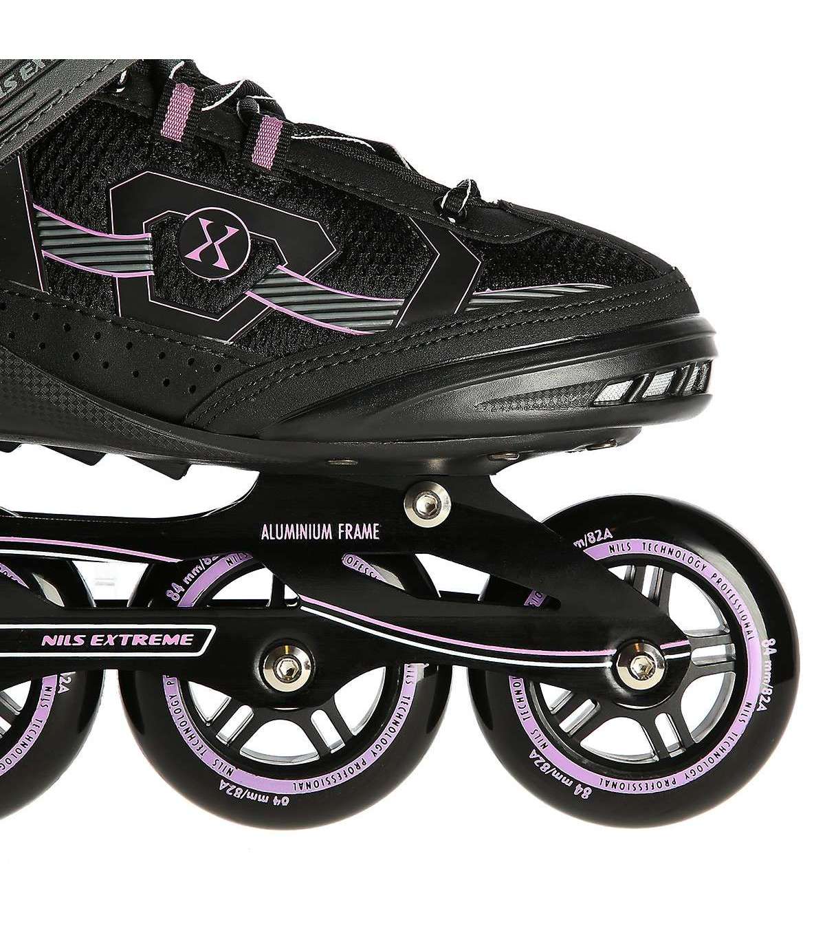 NA9157 Nils Extreme is a model of inline skates designed for beginners and intermediate skaters. It is a combination of interesting design with the highest quality materials that guarantee very high comfort of use.High qualityThe shoe is made of synthetic leather, EVA and velvet material, MESH mesh and high-density foam. Thanks to this, the ride will be extremely comfortable. In addition, it has a breathable membrane and is ventilated.Solid constructionThe inline skate is very light thanks to the aluminum skid and the base of the shoe, which is made of high quality PP. In addition, soft wheels guarantee good adhesion to the ground and absorb all vibrations well, while ABEC9 class bearings ensure high quality traction.SecurityFastening the shoe with a two-section buckle, Velcro and laces ensures maximum safety while driving, while the brake made of the highest quality impact-resistant PP will ensure safe stopping, even at relatively high speeds.Specification:Inline Skate: AluminumBearings: ABEC9Shoe: semi-soft with ventilation systemMaterial:VelvetMeshEVASynthetic leatherHigh-density foamBreathable membraneWheels:PU 84mm/82A (38)Clasp:Two-section buckleVelcro strapLacingInner shoe length: 280 mmBrake: Impact resistant PPRemarks:Not for commercial use PN-EN 13843:200924 months warrantyImporter: Abisal Ltd. | Poland | 41-807 Zabrze | Pyskowicka Street 17 | e-mail: abisal@abisal.plAbisal Ltd.. declares that the products sold by the company are safe and meet the requirements contained in the Act on General Product Safety of December 12, 2003. (Journal of Laws of December 31, 2003)