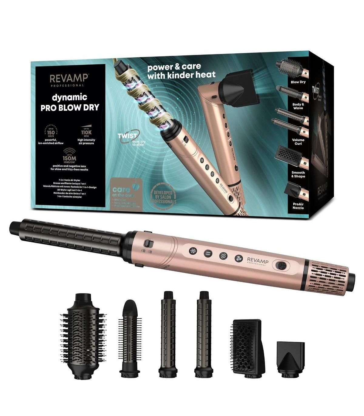 6 stiilitarvikut: sisaldab ovaalset pintslit volüümi suurendamiseks ja lokitünnid kopsakate lokkide jaoks.