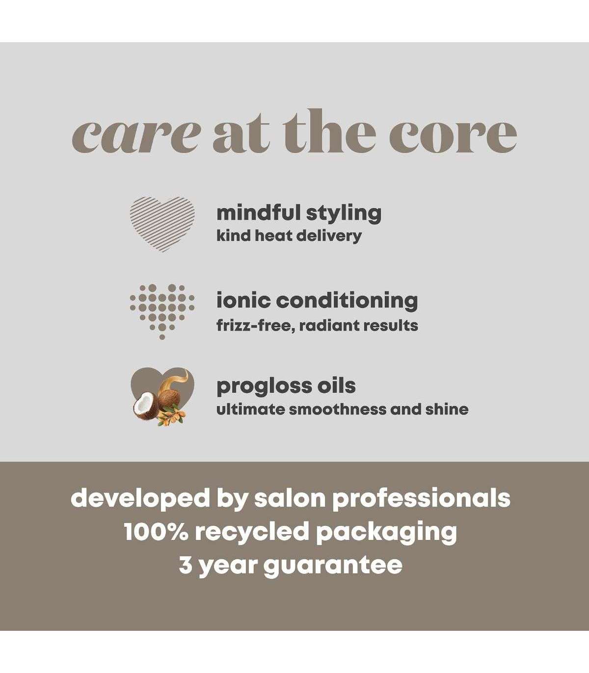 Täiustatud tehnoloogia: Progloss™ keratiini, argaania- ja kookosõliga infundeeritud keraamilised tünnid ja pintslid annavad sileda ja läikiva tulemuse.