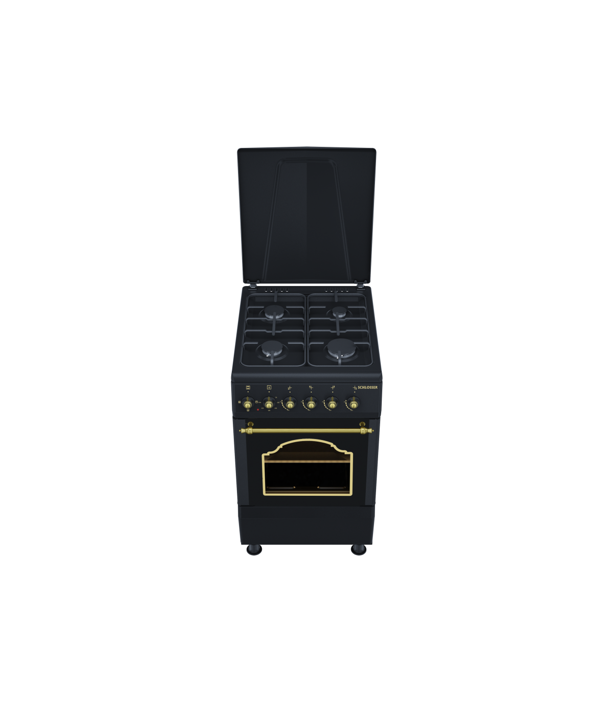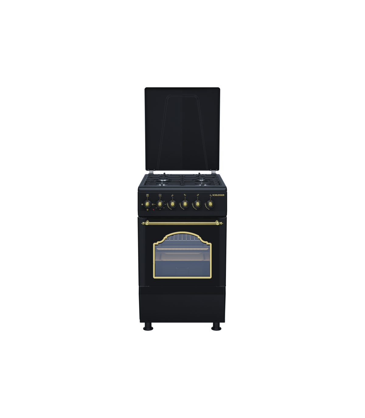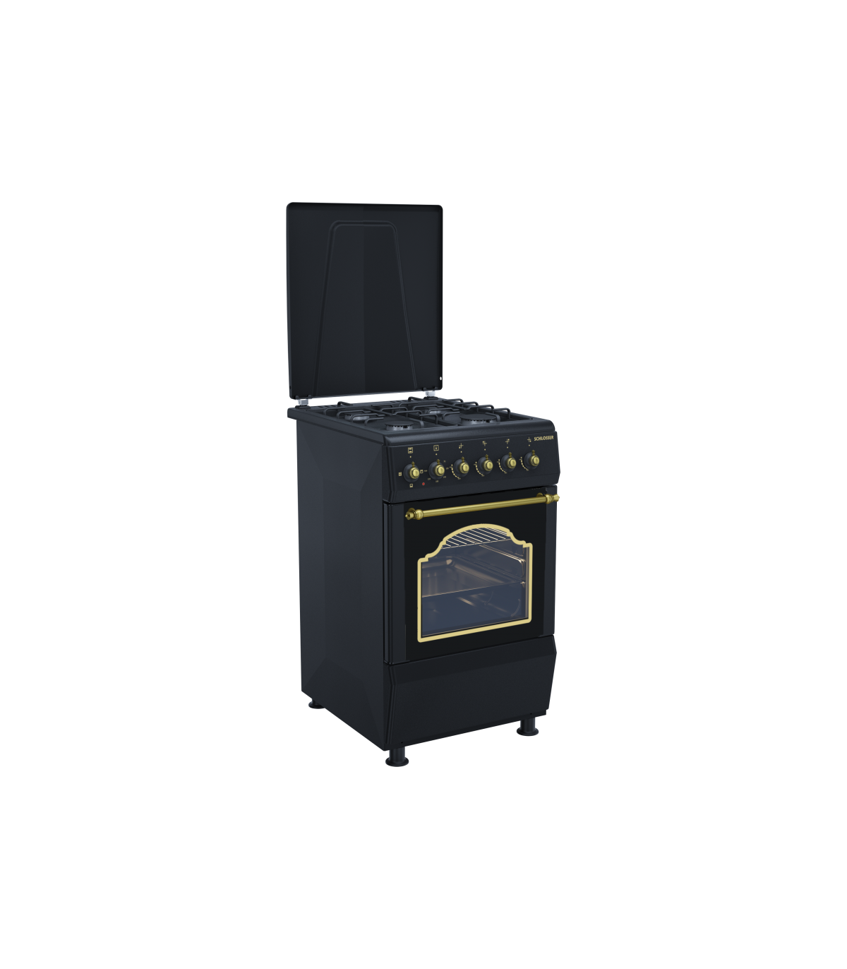 Nelja gaaspõletiga ja elektriahjuga pliit Schlosser FS5403MAZD. Ahjul on kahekordse uksega klaas ning kergelt puhastatav emailitud kate.