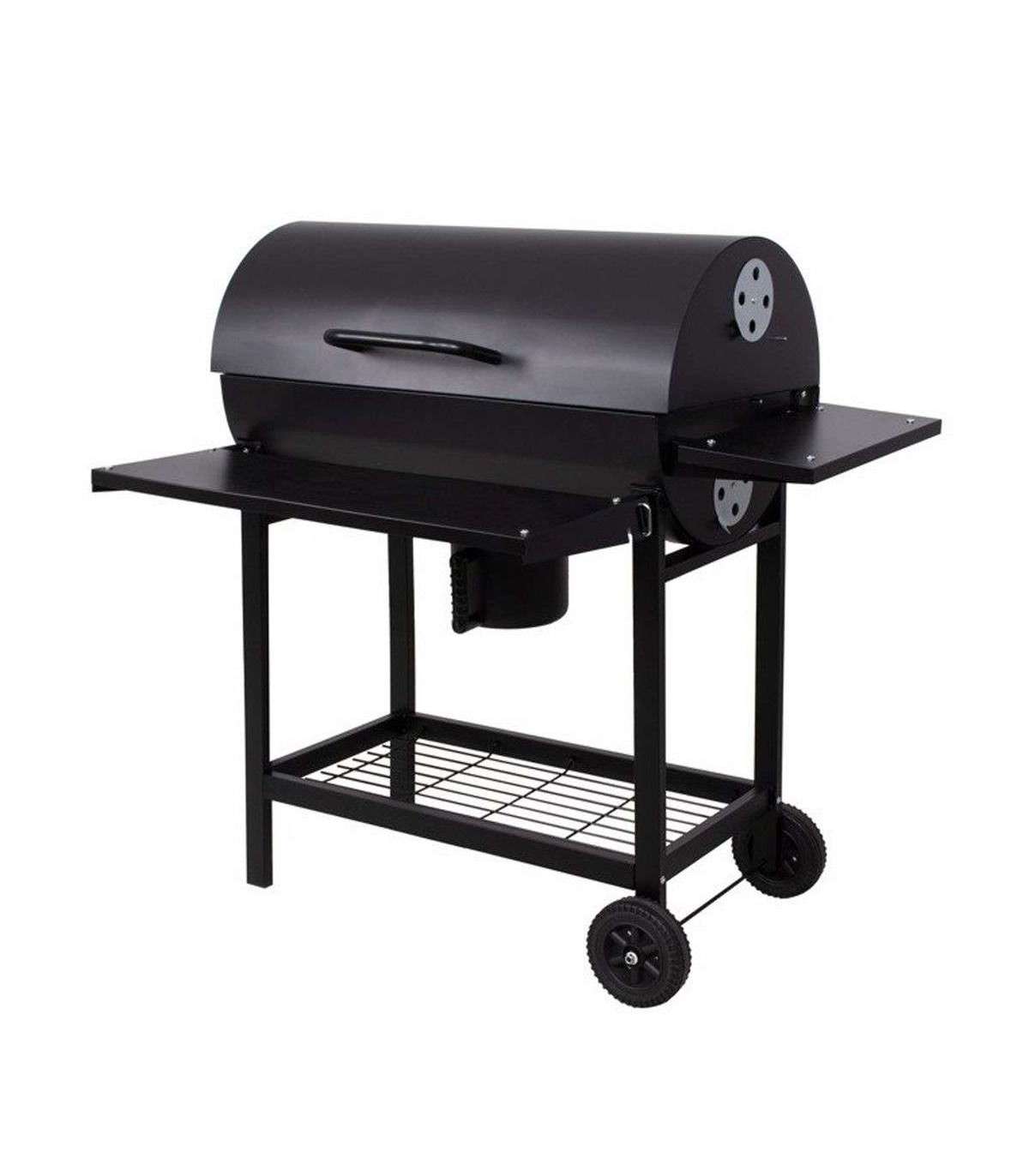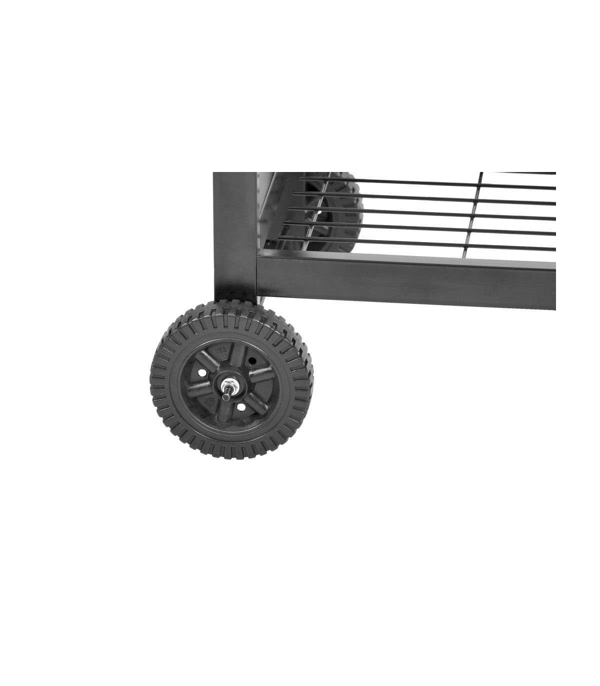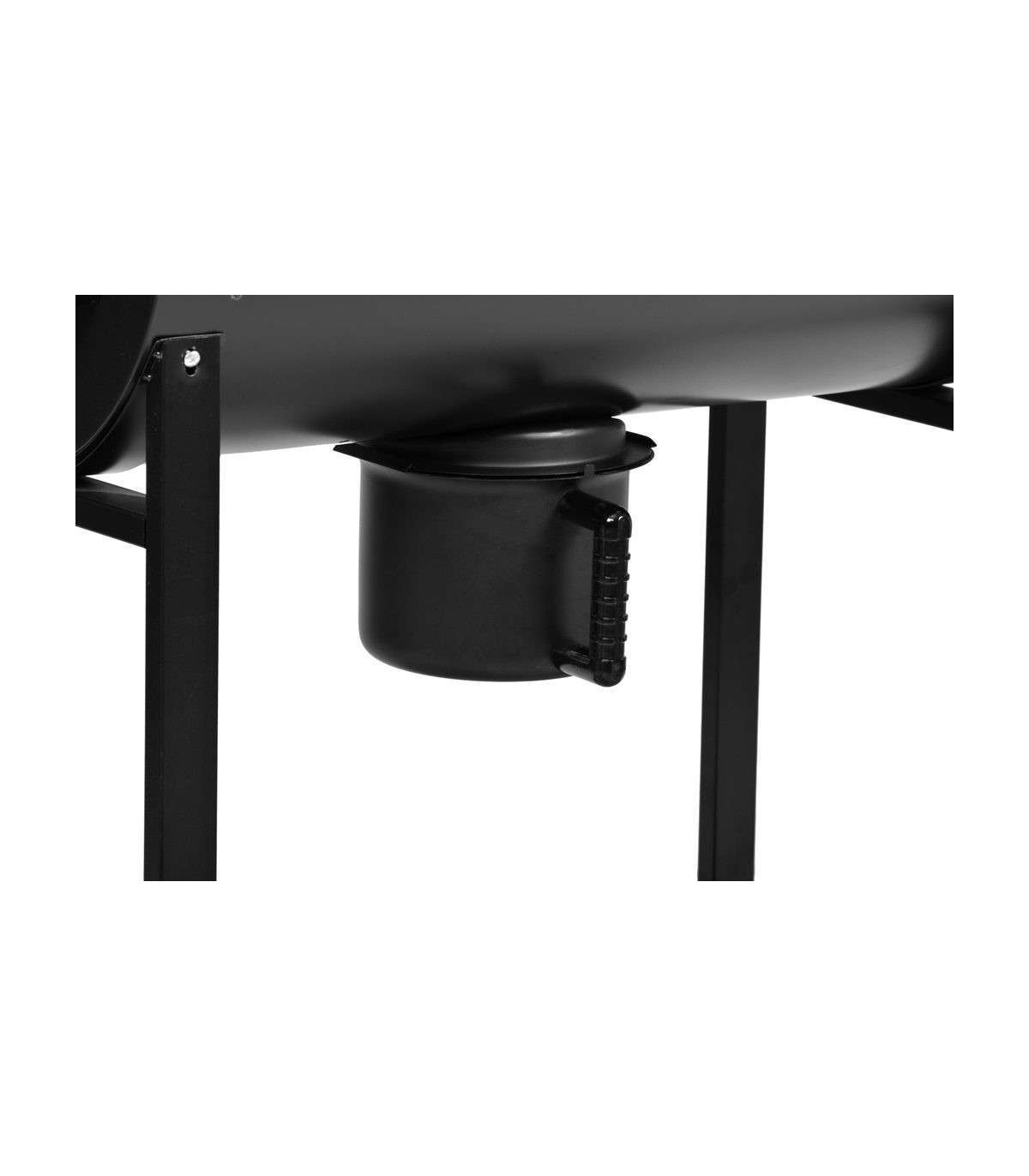 Vastupidavast lehtterasest valmistatud söegrill, värvitud musta kuumakindla värviga, suured tööpinnad, rattad, tuhatoos